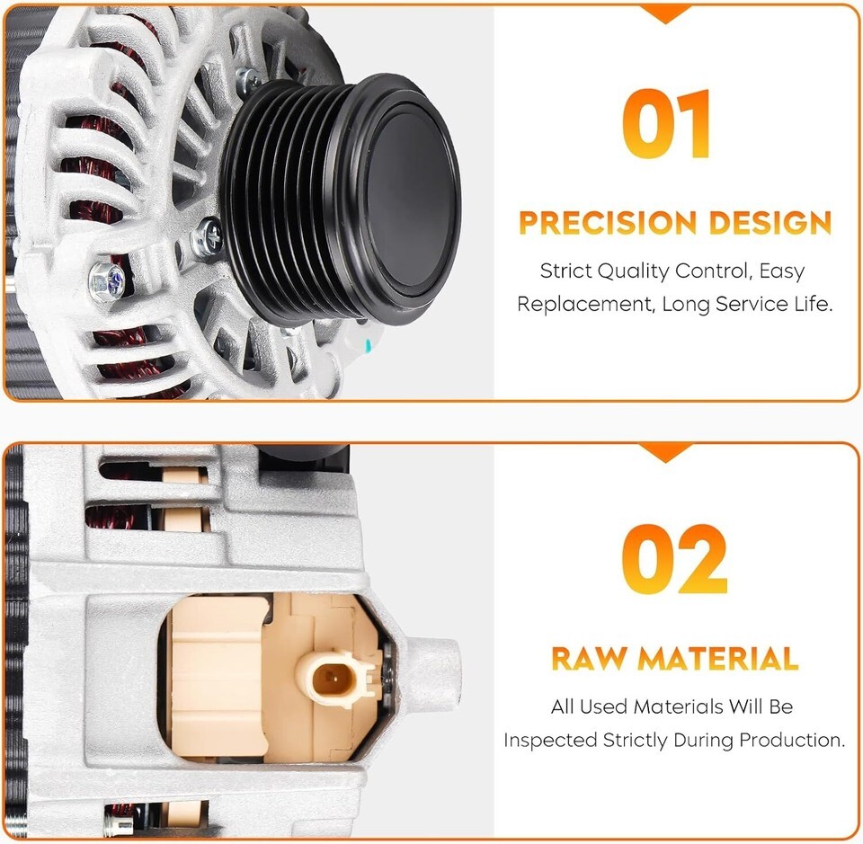 Premium Alternators: Alternators are tested by high thermal environment and high power demand to ensure product quality and durability. Replace for Part Number: ?31100-5A2-A02, 31100-5A2-A02RM, AHGA88, 14489, 11999, A5TL0581ZC Compatible with: for Honda Accord 2.4L 2013-2017 Specifications: Voltage: 12, Rotation: CW, Amps: 110, Clock: 2, Regulator: IR, Fan: IF Precision Design: All dimensions and contact points of the alternator are rigorously measured to ensure precision and ease of direct mounting.