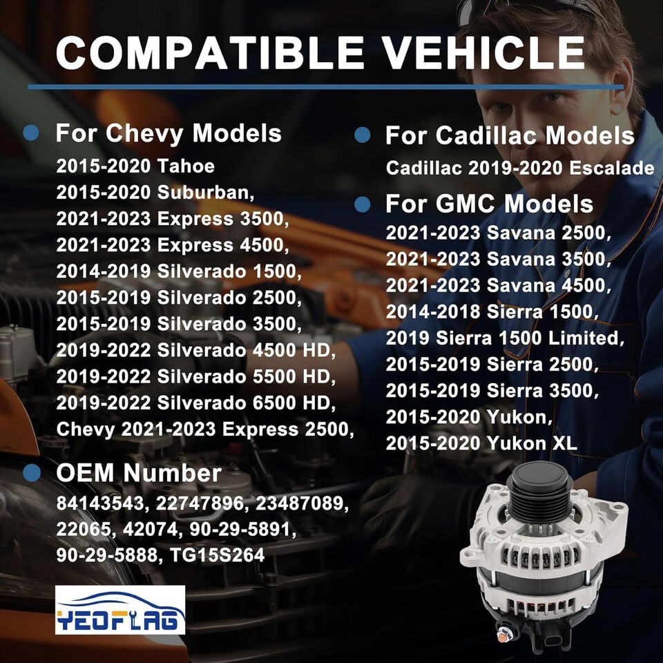 OEM Numbers: 84143543, 22747896, 23487089, 22065, 42074, 90-29-5888, 90-29-5891, TG15S264 Alternator Compatible with Chevy: for Express 2500 2021-2023, for Express 3500 2021-2023, for Express 4500 2021-2023, for Silverado 1500 2014-2019, for Silverado 2500 2015-2019, for Silverado 3500 2015-2019, for Silverado 4500 HD 2019-2022, for Silverado 5500 HD 2019-2022, for Silverado 6500 HD 2019-2022, for Suburban 2015-2020, for Tahoe 2015-2020 Alternator Compatible with Cadillac: for Escalade 2019-2020; Compatible with GMC: for Savana 2500 2021-2023, for Savana 3500 2021-2023, for Savana 4500 2021-2023, for Sierra 1500 2014-2018, for Sierra 1500 Limited 2019, for Sierra 2500 2015-2019, for Sierra 3500 2015-2019, for Yukon 2015-2020, for Yukon XL 2015-2020 Automotive Alternator Specifications: Amperage Rating-150 Amp, Voltage-12.0 Volt, Pulley Groove Quantity-6, Rotation Direction-Clockwise The alternator is made of CNC machined castings with high temperature lubricants and double lip rubber seals to minimize friction, vibration and noise; the rotor and stator are calibrated and then sealed with a secondary insulating coating to prevent short circuits.