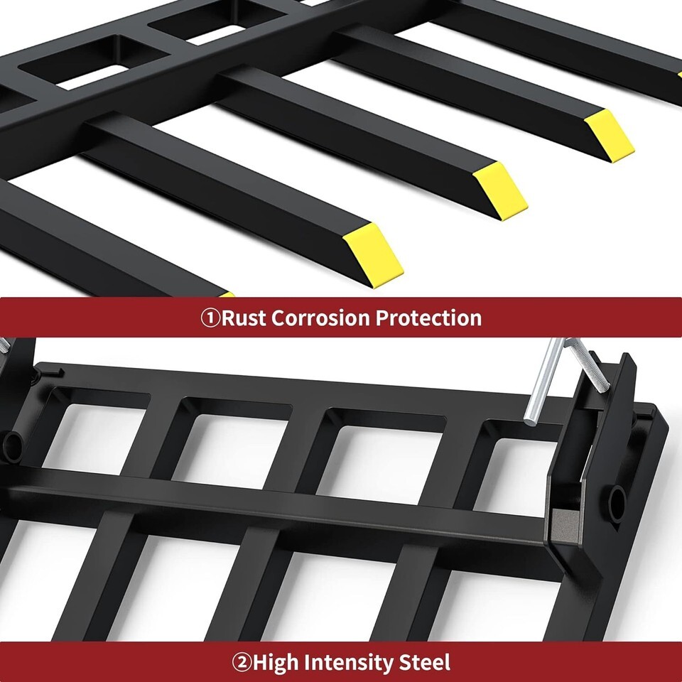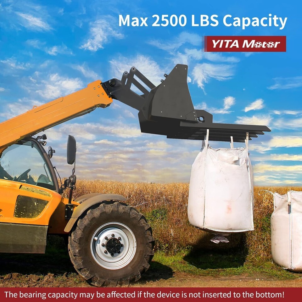 Heavy Duty Material: Surface of the product is sprayed with plastic to effectively place the product rust vcorrosion. This clamp on debris forks is made of high-quality materials and has excellent load-bearing performance, which has max load capacity up to 2500 lbs. Easy Installation: Simply slide the debris forks over the cutting edge of the bucket and clamp it down to lock. With the capability to hauling logs, lumber, and firewood and move fence posts, hay bales, clear debris and so on. Usage Scenarios: The 48" bucket debris forks are used widely in farms, factories, and warehouses for highly efficient mechanical loading / unloading, stacking, and short distance transportation, the pallet forks easily handles palletized loads. Item Specifications: The overall size of the tractor debris forks is 31" (L) x 42" (W). With a weight of approximately 70.99 lbs, and 5 fork tines measure 21" (L) x 2" (W) x 2" (H), it fits 48" bucket or bigger size bucket. Fitment Reference: YITAMOTOR clamp on debris forks compatible with 48? or bigger size tractor bucket. Buckets less than 2 inches thick are perfect for this product.