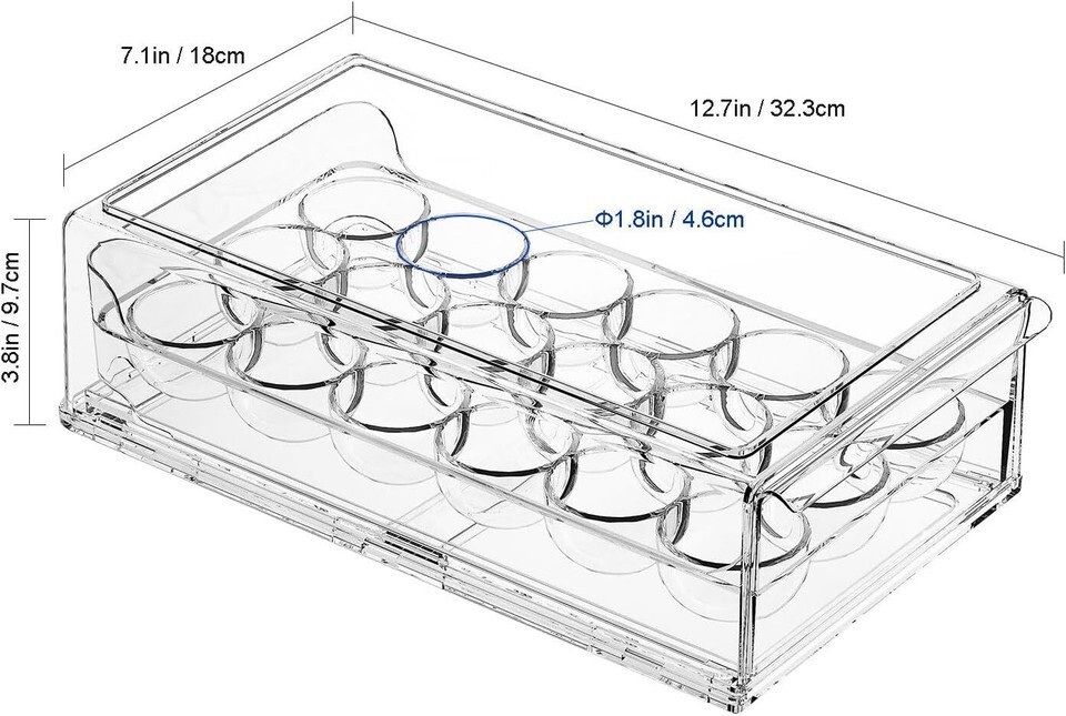 The durable refrigerator egg storage bin is equipped with 18 slots to protect each egg, clear material for easy visibility of tray contents. Perfect spaces saver, and so much better than reusing the disposable cartons. This is a very nice container for eggs. The little handle on one end of the egg tray can slide out and easy access to your eggs. Egg storage container features a drawer design, making it stackable and protecting egg from crushing when you put other things on top of it. Size: 12.7 x 7.1 x 3.8 inches. The egg storage container holds up to 18 eggs. BPA free. Easy to clean. No dishwasher safe, hand wash only.