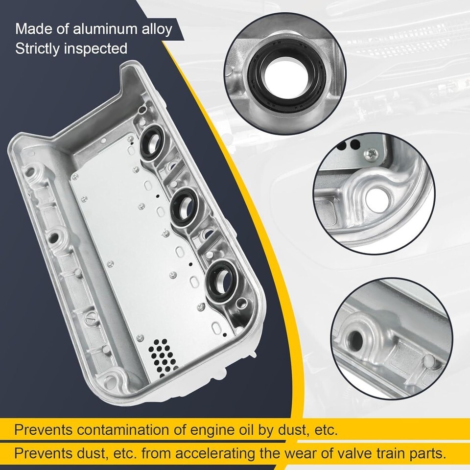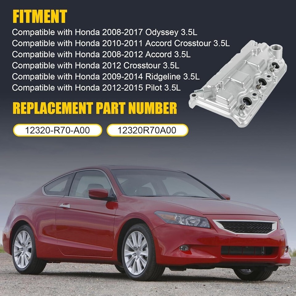 FITMENT:Compatible withHonda,2008-2017 Odyssey 3.5L,2008-2012 Accord 3.5L,2010-2011 Accord Crosstour 3.5L,2012 Crosstour 3.5L,2012-2015 Pilot 3.5L,2009-2014 Ridgeline 3.5L REPLACEMENT PART NUMBER:12320-R70-A00, 12320R70A00. PRODUCT FUNCTION:If you don't know when to replace it, you can refer to the following examples, such as the dashboard warning lights come on, the vehicle leaks oil, the oil has a burning smell, the engine smoke or misfire and other dangerous problems, the above problems can be replaced with the Aluminium Front Engine Valve Cover, which is capable of solving your problems and at the same time, has the characteristics of wear resistance and durability and a long lifespan of reduction. Failure INSTALLATION: If you are unable to install it yourself, please seek help from a professional installer PACKAGE INCLUDED:Aluminium Rear Engine Valve Cover x 1