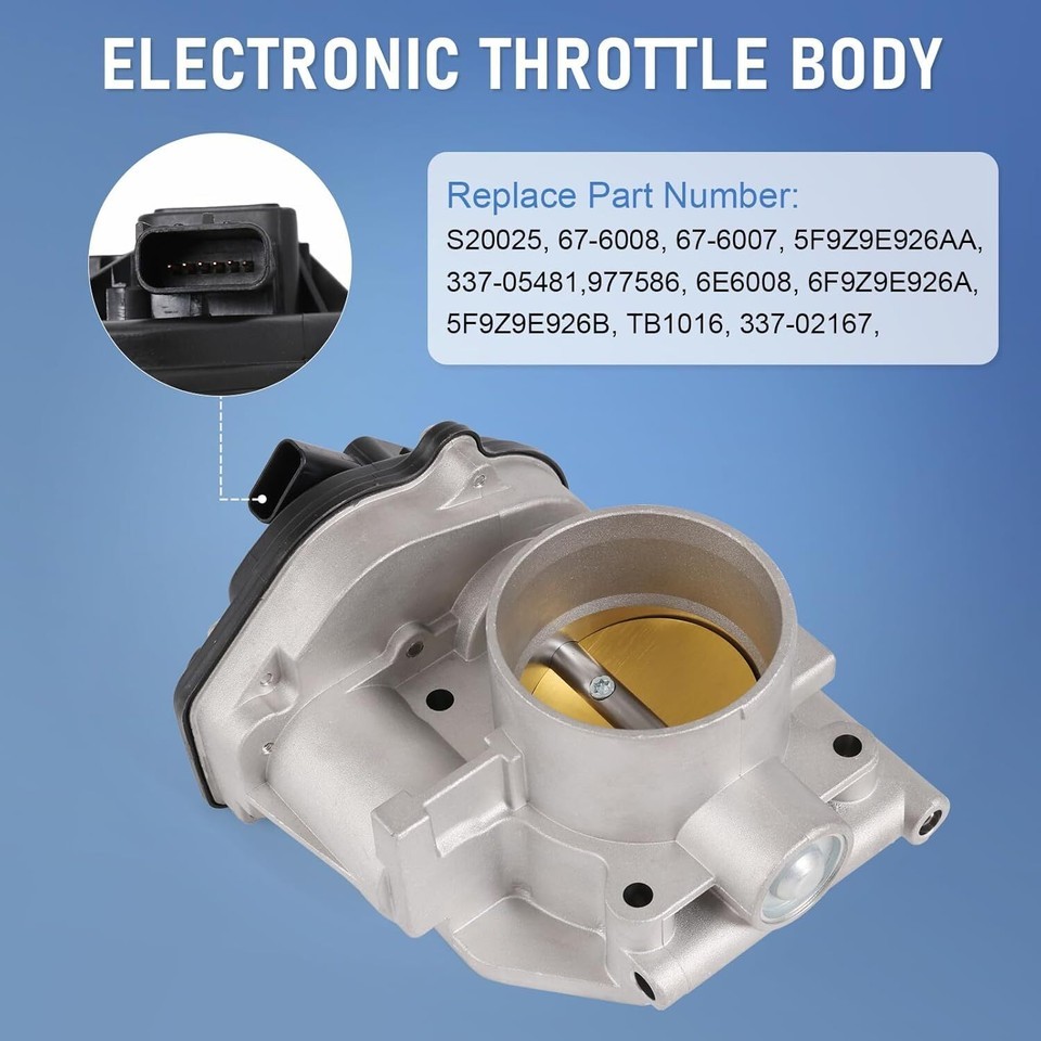 [COMPATIBLE WITH] Compatible with Ford Five Hundred 2005-2007 4-Door 3.0L, compatible with Ford Freestyle 2005-2007 4-Door 3.0L, compatible with Mercury Montego 2005-2007 4-Door 3.0L. Please scroll down to product description for complete list of model and year. [REPLACE PART NUMBER] S20025, 67-6008, 67-6007, 5F9Z9E926AA, 5F9Z9E926B, TB1016, 337-02167, 337-05481, 977586, 6E6008, 6F9Z9E926A. Please check the part number and fitment before placing order. [QUALITY ASSURANCE] High quality and rigorous testing. This throttle body is made of high quality material for high precision and durability. And it had undergone rigorous testing and inspecting to ensure all performance parameters meet the standard, ensure long time to use. [OEM FIT] Upgrade critical component parts include the housing, throttle plate, position sensors and throttle actuator motor meet or exceed OE standard. It is comparable in fit, form and function to the original part, ensures proper fit and performance. [EASY TO INSTALL] This electronic throttle body can be easy to install. Directly plugs into the original equipment wiring harness with no adapter required, which save much time.