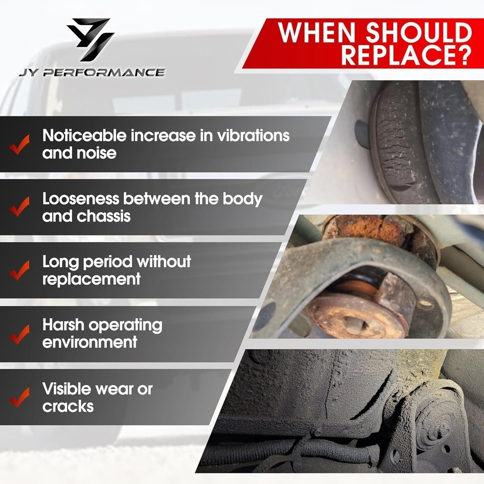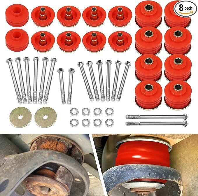 Fitment: The Body Cab Mount Bushing Kit fits Compatible with Ford F250 F350 Super Duty 2008-2016 2WD 4WD. It can absorb the vibration and shock from the road surface, reduce the noise and vibration felt by the body and passengers, and improve the ride comfort Material: High-performance polyurethane Body Mount Bushing Kit can significantly improve vehicle performance, with corrosion resistance, aging resistance, durable and reliable characteristics, Compatible with Ford F250 F350 modification requirements Durability: The Body Mount Bushing Kit is designed to provide better resistance to oil, chemicals and UV rays, maintain stable performance at different temperatures, and guarantee vehicle comfort, handling performance and safety, improving the driving experience Note: When your car has increased noise, loosening between the body and the frame, abnormal handling performance, and not replaced for a long time, replace the Body Mount Bushing Kit in time can ensure the comfort, handling performance and safety of the vehicle Complete Kit: The Body Mount Bushing Kit includes all necessary components for a comprehensive installation: body cab mounts, steel sleeves, and hardware. Each part is designed and manufactured to OEM specifications and you can directly to replace
