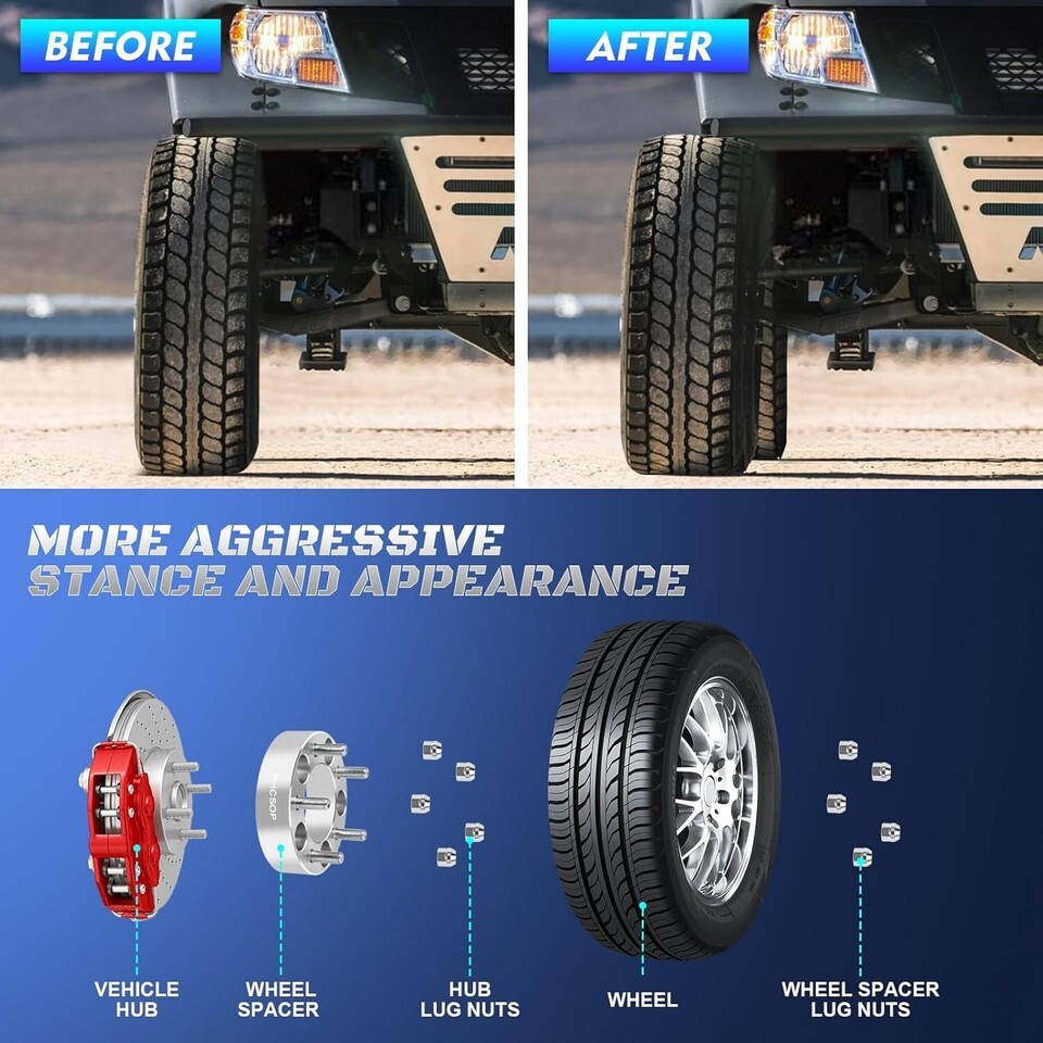 ? 2PCS Wheel Spacers: Thickness: 1.5" (38mm) | Vehicle Bolt Pattern: 5x4.5" (5x114.3mm) | Wheel Bolt Pattern: 5x4.5" (5x114.3mm) | Hub Bore: 82.5mm | Thread Pitch 1/2" x 20. (Notice: Because our products are universal, if you have the problem of too long screw during installation, please cut off the excess) ? Ford Wheel Adapters: Compatible with 1994-2014 Mustang, 1982-2012 Ranger, 1991-2011 Crown Victoria, 2003-2004 Mach 1, 2006-2014 Edge, 1990 91 92 93 94 95 96 97 98 99 00 01 02 03 04 05 06 07 08 09 10 11 12 13 14 15 16 17 18 19 Explorer. ? Jeep Wheel Adapters: Compatible with 1987-2006 Wrangler, 1984-2013 Cherokee, 1986-1992 Comanche, 1992-1998 Grand Cherokee, 2001 2002 2003 2004 2005 2006 2007 2008 2009 2010 2011 2012 2013 Liberty. ? High Quality: Forged from 6061-T6 aluminum alloy, CNC automatically machined to ensure high precision and stability, with anodized and heat-treated surfaces to enhance corrosion resistance, and comes with 10.9 grade premium studs. ? Spacer Features: Provide additional clearance between the wheel and hub assembly, thereby improving the vehicle's performance in terms of handling and traction. It will make your vehicle more stable and allow installation of lift/lowering kits and larger traction tires. ? Important Notes: Before purchasing these wheel spacers, please recheck your vehicle compatibility (year/make/model) in the product description. If you have any questions, please contact the customer service team for further assistance.