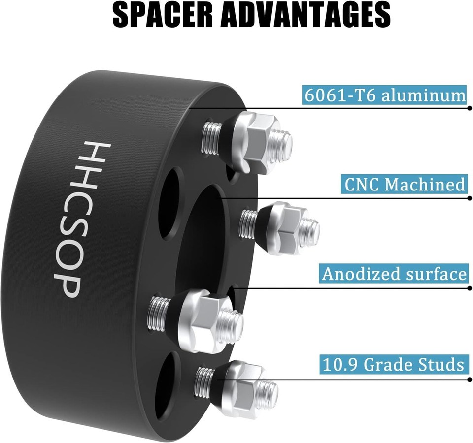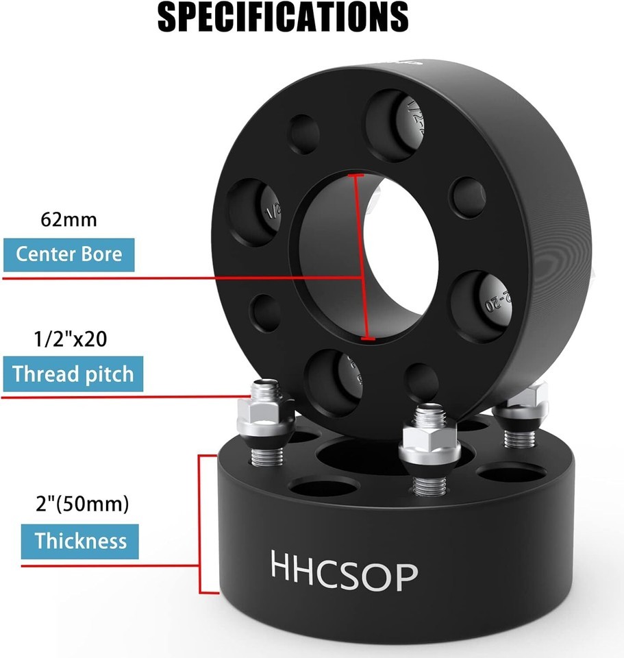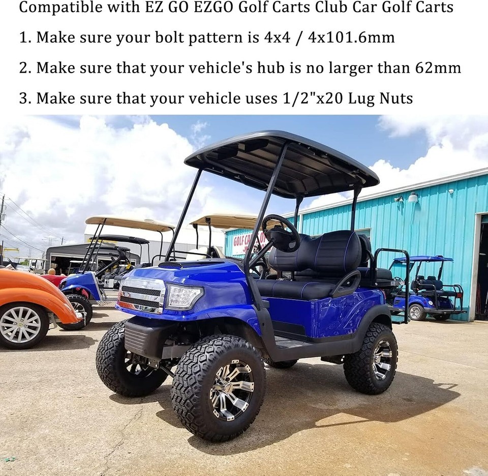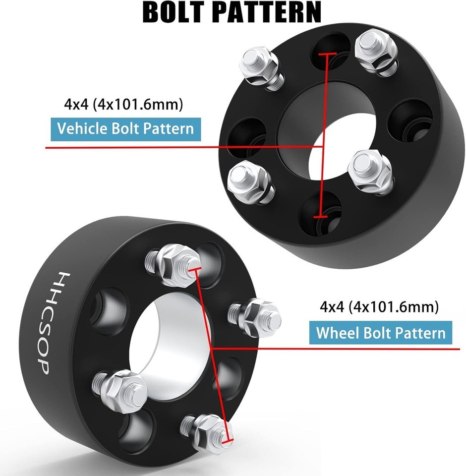 ? 4PCS Wheel Spacers: Thickness: 2"(50mm) | Vehicle Bolt Pattern: 4x4 (4x101.6mm) | Wheel Bolt Pattern: 4x4 (4x101.6mm) | Center Bore: 62mm | Thread Pitch: 1/2"x20. ? Golf Cart Wheel Adapters: Compatible with many 4x4", 4x101.6, 4x100 Bolt Pattern EZ GO EZGO Club Car Golf Carts and ATV vehicles. (Vehicle hub studs and lug nuts must be with 1/2"-20 1/2x20 1/2"x20 thread pitch) ? High Quality: Forged from 6061-T6 aluminum alloy, CNC automatically machined to ensure high precision and stability, with anodized and heat-treated surfaces to enhance corrosion resistance, and comes with 10.9 grade premium studs. ? Spacer Features: Provide additional clearance between the wheel and hub assembly, thereby improving the vehicle's performance in terms of handling and traction. It will make your vehicle more stable and allow installation of lift/lowering kits and larger traction tires. ? Important Notes: Before purchasing these wheel spacers, please recheck your vehicle compatibility (year/make/model) in the product description. If you have any questions, please contact the customer service team for further assistance.