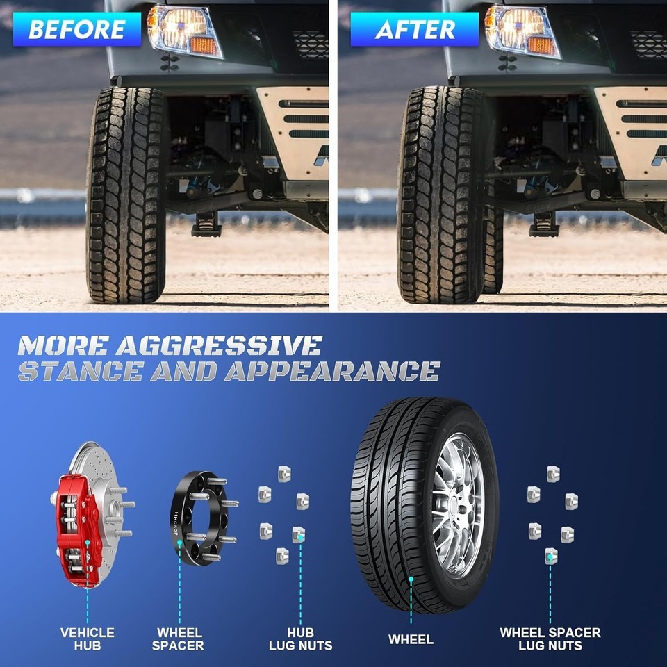 ? 4PCS Wheel Spacers: Thickness: 1" (25mm) | Wheel bolt pattern: 6x5.5 (6x139.7mm) | Vehicle bolt pattern: 6x5.5 (6x139.7mm) | Hub bore: 108mm | Thread pitch: M12x1.5, Recommended torque: 70-80 FT/LBS. ? Compatible vehicles: Toyota 1989-2023 4Runner, 2007-2023 FJ Cruiser, 1995-2023 Tacoma, 2000-2006 Tundra, 1980-1997 Land Cruiser; Lexus 2014-2019 GX400, 2009-2023 GX460, 2002-2009 GX470; GMC 2004-2012 Canyon. (More details see description) ? High Quality: Forged from 6061-T6 aluminum alloy, CNC automatically machined to ensure high precision and stability, with anodized and heat-treated surfaces to enhance corrosion resistance, and comes with 10.9 grade premium studs. ? Spacer Features: Provide additional clearance between the wheel and hub assembly, thereby improving the vehicle's performance in terms of handling and traction. It will make your vehicle more stable and allow installation of lift/lowering kits and larger traction tires. ? Important Notes: Before purchasing these wheel spacers, please recheck your vehicle compatibility (year/make/model) in the product description. If you have any questions, please contact the customer service team for further assistance.