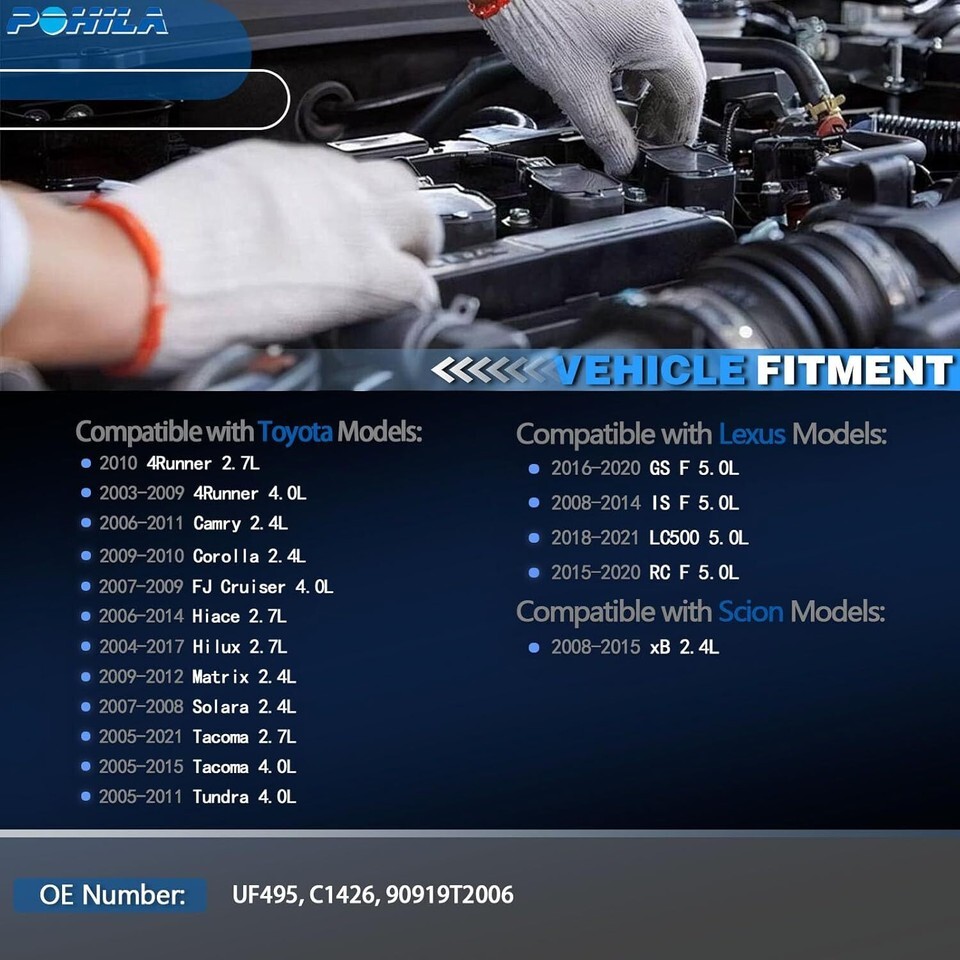 ?Fitment?Set of 4 ignition coil compatible with Toyota Lexus Tundra 4Runner Tacoma Solara Matrix 2008 IS F 2006 2007 2008 2009 2010 2011. Please scroll down to product description for complete list of model and year. ?Compatible Part Numbers?Coil packs compatible to UF495, C1426, 90919T2006. ?Premium Quality?All of the ignition coils are built to achieve or exceed OE specifications, subject to strict quality control testing,offer the best possible performance and dependability. ?Coils Features?The ignition coils are easy to install,installed with the original chip to enhance the heat resistance, wear resistance and corrosion resistance of each coil. Thereby reducing the common problems of ignition coil misfire, long starting time, poor fuel economy, insufficient power, etc. ?Precautions for Purchase?Please confirm the compatibility according to the year/make/model of your vehicle and the OE number of the replaceable part.