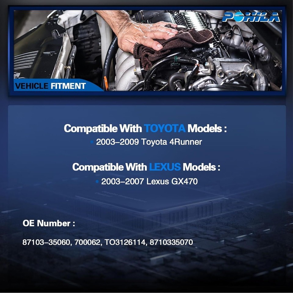 ?OEM Part Number?OE Replacement HVAC Blower Motor, Directly Fit. Reference Number: 87103-35060, 700062, TO3126114, 8710335070. Same Dimensions as OE part, Directly Fit; Stable characteristics and high reliability; Larger Air Volume and Lower Noise. ?Fitment?Compatible with 2003-2007 Lexus GX470, 2003-2009 Toyota 4Runner. It can be easily installed by simply removing a few screws. When replacing the blower motor, it is best to also replace the blower motor relay/resistor with a new one. ?Advantage Of The Motor?Wind power strong. Adopt new technology and excellent production equipment to make products more environmentally friendly and energy-saving.Permanently lubricated self-aligning bearings with long design life and reliable performance. ?Premium Quality?This air conditioner blower motor is made from motor-specific silicon steel and premium enameled copper wire and is manufactured to OE specifications for direct installation without modification. Designed to keep your vehicle's HVAC system in top shape. ?Service Warranty?For any pre or after-sale replacements or performance questions or solutions, just email us and we will provide a professional, friendly, and supportive reply within 24 hours.Do check your car model in the "amazon confirmed fit" in the top left corner before ordering.