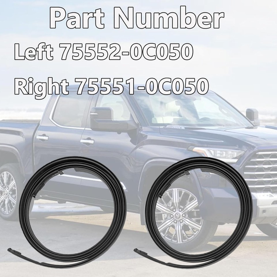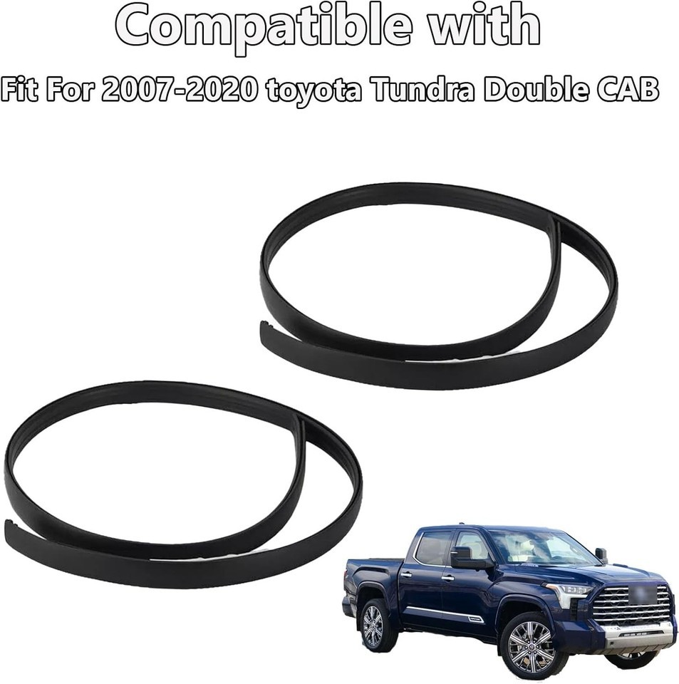 ?Compatible With?Car Roof Seal Weatherstrip Kit is designed to Fit for Toyota Tundra Double Cab 2007 2008 2009 2010 2011 2012 2013 2014 2015 2016 2017 2018 2019 2020 (Not fit for Crewmax) ?Replace OE Number Fit for Toyota Tundra Weather Stripping?: 75551-0C050 75552-0C050; Please check the OEM Number whether it fits your vehicle before purchasing ?Easy to Install?This car roof sealing strip is manufactured to the OE specification to provide factory appearance and direct-fit, just takes 5-10 minutes to replace the worn molding weatherstrips. ?Premium Quality?Long life-span matters, that is why our roof trim rain sael molding is made of high-quality rubber, ensures the accuracy of size matching, and achieve the functions of sealing, leakage prevention. ?Package Include?1 Left Roof Molding Drip Weatherstrip?1 Right Roof Molding Drip Weatherstrip.