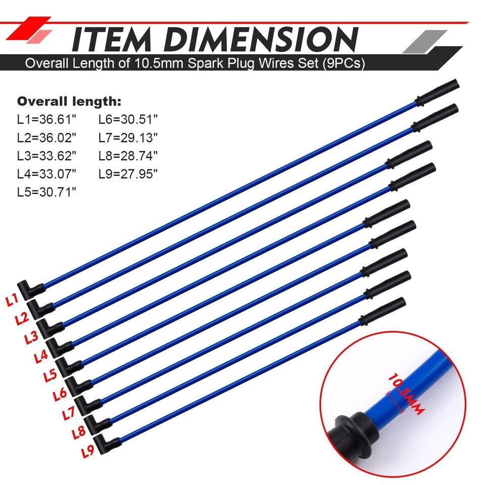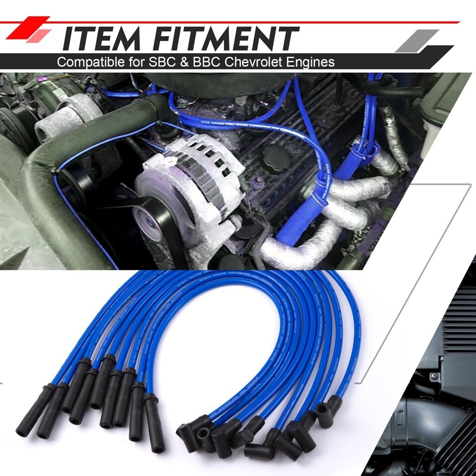 [Fitment]: Universal spark plug wires fit for SBC and BBC Chevrolet engines; reference number: SP10-390-1024. [Easy Installation]: 90 boots for distributor; Straight boots for spark plug and Coil-In-Cap HEI design system. [Premium Material]: 100% pure silicone insulator outer layer, which can provide a good protection for the Kevlar spiral wound core from high temperature and moisture. [High Performance]: Equip your vehicle with the performance spark plug wires to enhance the spark at the plugs. These wires are capable of facilitating the delivery of maximum horsepower and ensuring optimal engine performance. [Purchase with Confidence]: We provide a one-year warranty; Please do not hesitate to contact the Spocoro seller if you encounter any issues. We will respond to you within 24 hours.