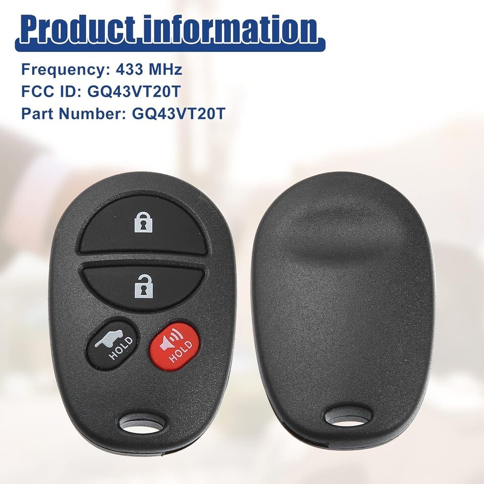 Fit for: for Toyota Sequoia 2008-2018, for Toyota Highlander 2008-2013 FCC ID: GQ43VT20T, FCC ID: GQ43VT20T Good Replacement: to replace your keyless entry remote key fob if it's broken. For example, the remote control key of the car doesn't work. Easy Installation: 1. The remote must be programmed and cut by a qualified locksmith or dealership. 2. Make sure the remote programming can work before cutting the key. 3. if meet the difficult, please check more infomation or video, don't program by yourself anytime. Package Includes: 2 Pcs Car Key fob with battery and Chip