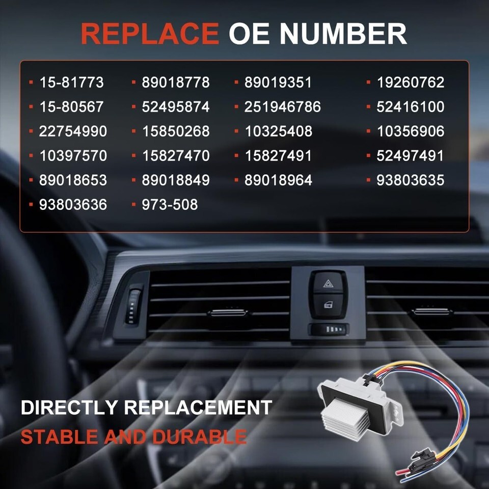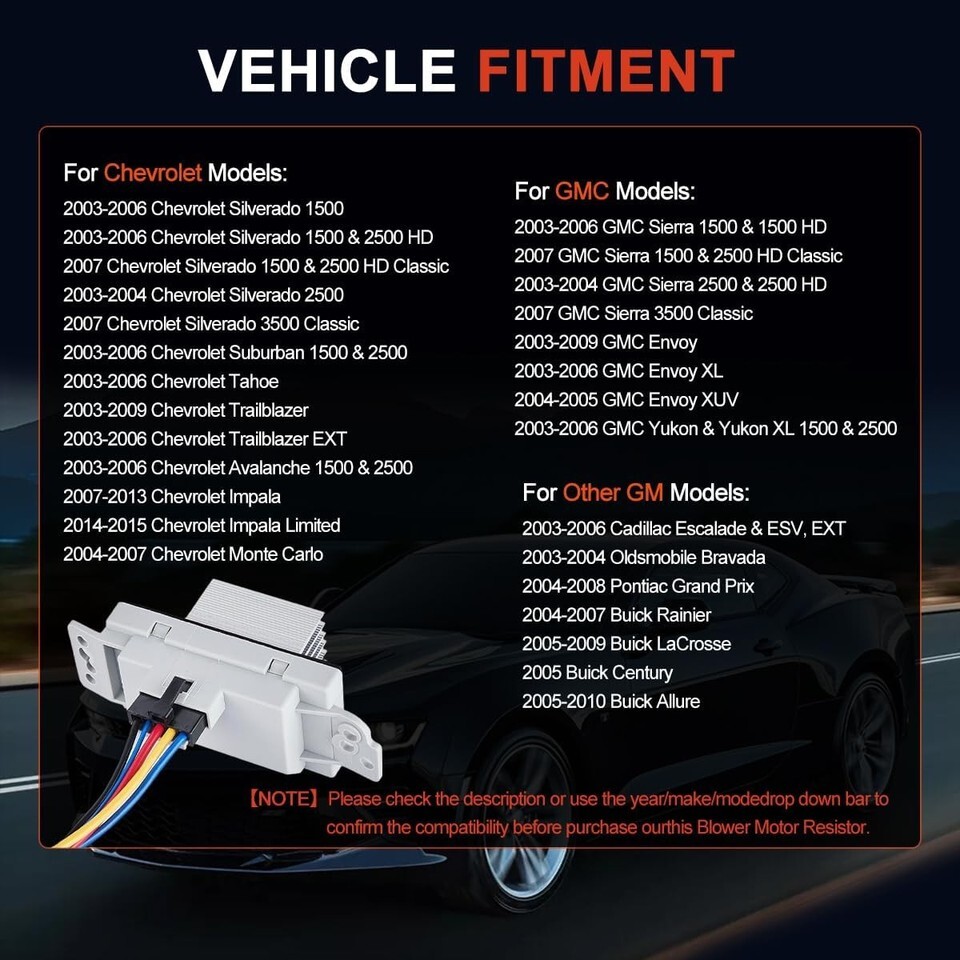 This Part Kit is compatible with vehicles with Auto AC Controls: Chevy 2003-2006 Silverado 1500 2500HD, 2003-2009 Trailblazer, 2004-2013 Impala | GMC 2003-2006 Sierra 1500 2500 Yukon, 2003-2009 Envoy | Buick 2004-2007 Rainier, 2005-2009 LaCrosse Allure, etc (Detailed list below). Replaces Part Numbers: 15-81773, 89018778, 89019351, 19260762, 15-80567, 52495874, 251946786, 52416100, 22754990, 15850268, 10325408, 10356906, 10397570, 15827470, 15827491, 52497491, 89018653, 89018849, 89018964, 93803635, 93803636, 973-508 This COMPLETE KIT includes the Blower Motor Resistor, New Wire Harness, and Wire Harness Connectors. Easy installation, Direct replace your original HVAC Fan Blower Motor Resistor. Please check your old part against the picture and also check its OEM Part Number before placing order to make sure this parts will fits on your vehicle