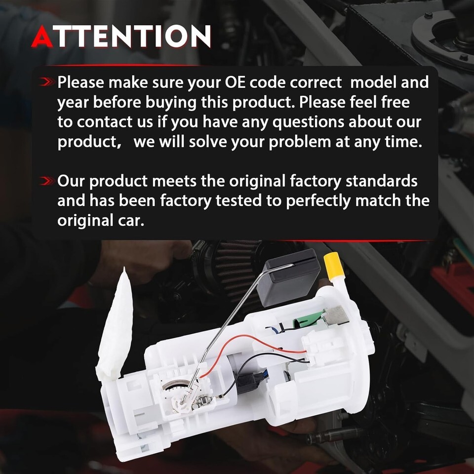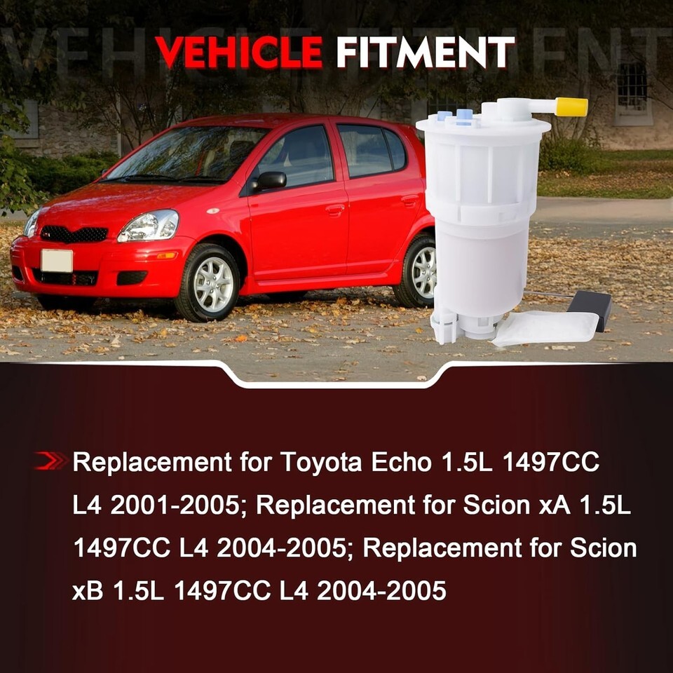 Replaces OEM Part Number: The Fuel Pump Module Replaces SP9030M, E9363M, P77369M, 570-2490, 2322121060, 9015950343, 768GE Compatible Models: The 23221-21060 Fuel Pump Module Replacement for Toyota Echo 1.5L 1497CC L4 2001-2005; Replacement for Scion xA 1.5L 1497CC L4 2004-2005; Replacement for Scion xB 1.5L 1497CC L4 2004-2005 Premium Material: This SP9030M Fuel Pump Module is made of premium material, corrosion-resistant and wear-resistant, can withstand the extreme working conditions. It's thoroughly tested to ensure performance and lasting quality High Performance: The fuel pump can fully deliver high-pressure fuel through the oil pipe to ensure that the fuel is continuously supplied to the nozzle, ensuring the smooth operation of the engine and avoiding insufficient fuel supply or fuel leakage Buy with Confidence: Before purchasing the Fuel Pump Module, we strongly recommend verifying your OE number and specific model to ensure a fit. Should you have any questions or require assistance, we are readily available to provide you timely service and support. Sincerely hope you have a happy life!