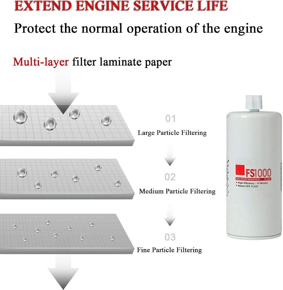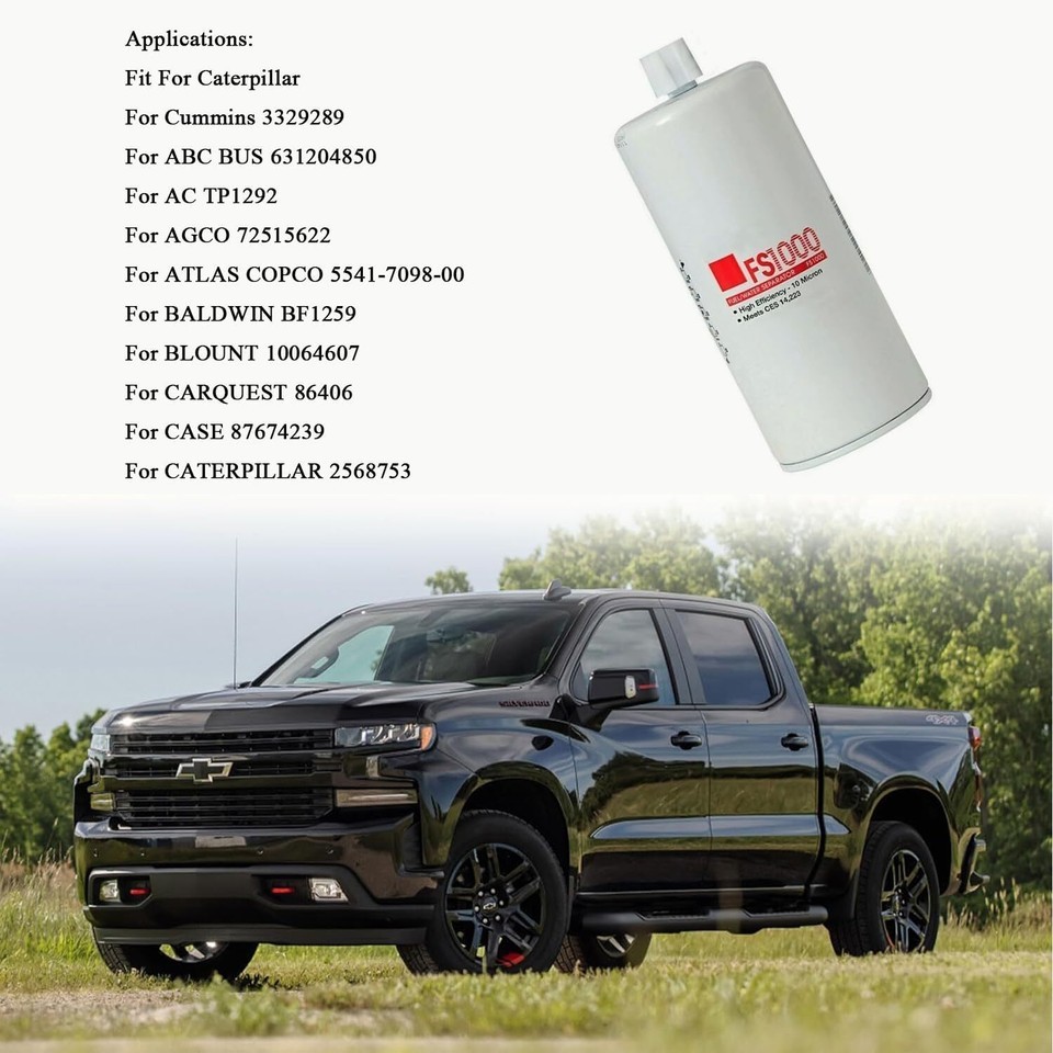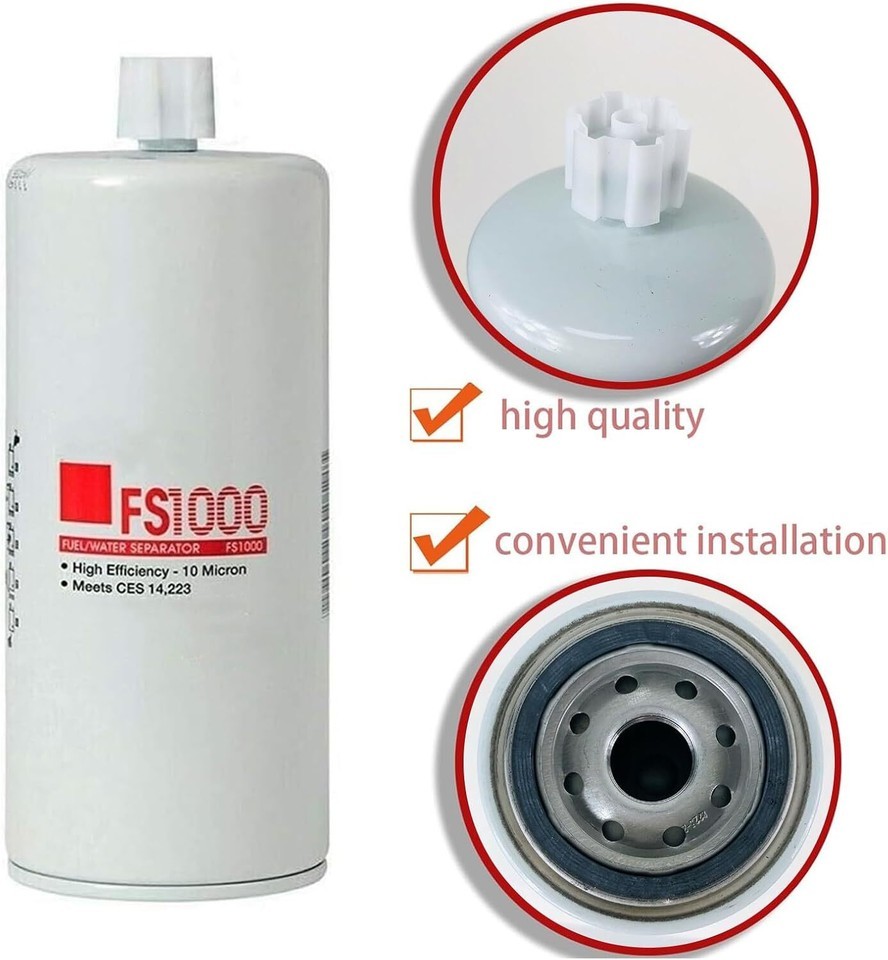 ?Replaces Part Number?- The Fuel Filter Replacement Replaces FS1000, 3329289, 4377880 2568753. ?Fitment?- FS1000 fuel water separator filter compatible with Kenworth, compatible with Peterbilt. ?Function?- The Fuel Filter Water Separator Element effectively separates the oil and water, filters the residue in the automobile fuel, makes the fuel-supply engine burn more purely, and protects your automobile's fuel system. ?Features?- Keep the fuel system clean and prevent pollutants from entering the engine, thereby protecting the normal operation of the engine. Extend its service life. ?NOTE?- These are after-sales replacement parts, not original parts. Please make sure to match with your vehicle before buying the Filter. Package includes: 4 x FS1000 Fuel Filter.