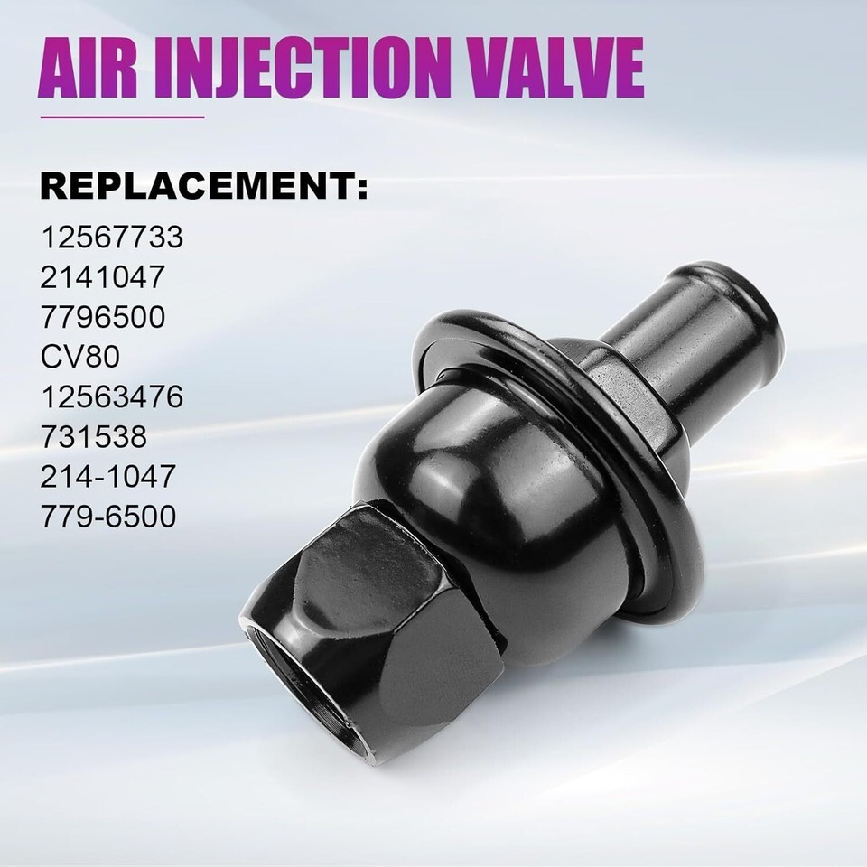 Compatible With Chevy:for Silverado 1500 ,Silverado 2500,Silverado 3500,Suburban 1500,Suburban 2500,Avalanche 2500,Silverado 2500 HD Classic.Express 1500,Express 2500,Express 3500,Impala,K1500,K1500 Suburban,K2500,K2500 Suburban,K3500,S10.Tahoe,Camaro,Cavalier,Corvette.Blazer,C1500,C1500 Suburban,C2500,C2500 Suburban,C35,C3500,C3500HD Compatible With GMC:for Yukon,Yukon XL 1500,Yukon XL 2500,Sonoma.Sierra 1500,Sierra 2500,Sierra 2500 HD,Sierra 3500,C3500,C3500HD.Savana 1500,Savana 2500,Savana 3500,C1500,C1500 Suburban,C1500 Suburban,C2500,C2500 2000,C2500 Suburban Compatible With:for Cadillac Escalade 1999-2000,Oldsmobile Bravada 1998-2001,Pontiac Firebird 2000-2002,Pontiac Sunfire 2001 The primary purpose of an air injection check valve is to control the unidirectional flow of air in a given system, preventing backflow of air. This valve design allows gas to pass in one direction only and prevents flow in the opposite direction. If a check valve is leaking, clogged, rattling, or deteriorating, i.e., gas is able to flow backward through the valve, this is an indication that the sealing performance of the valve has been degraded, possibly due to a worn out spool, spring failure, or a damaged seat. Replacement is then required to restore the system to normal operating condition.