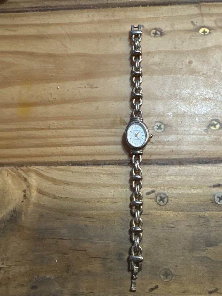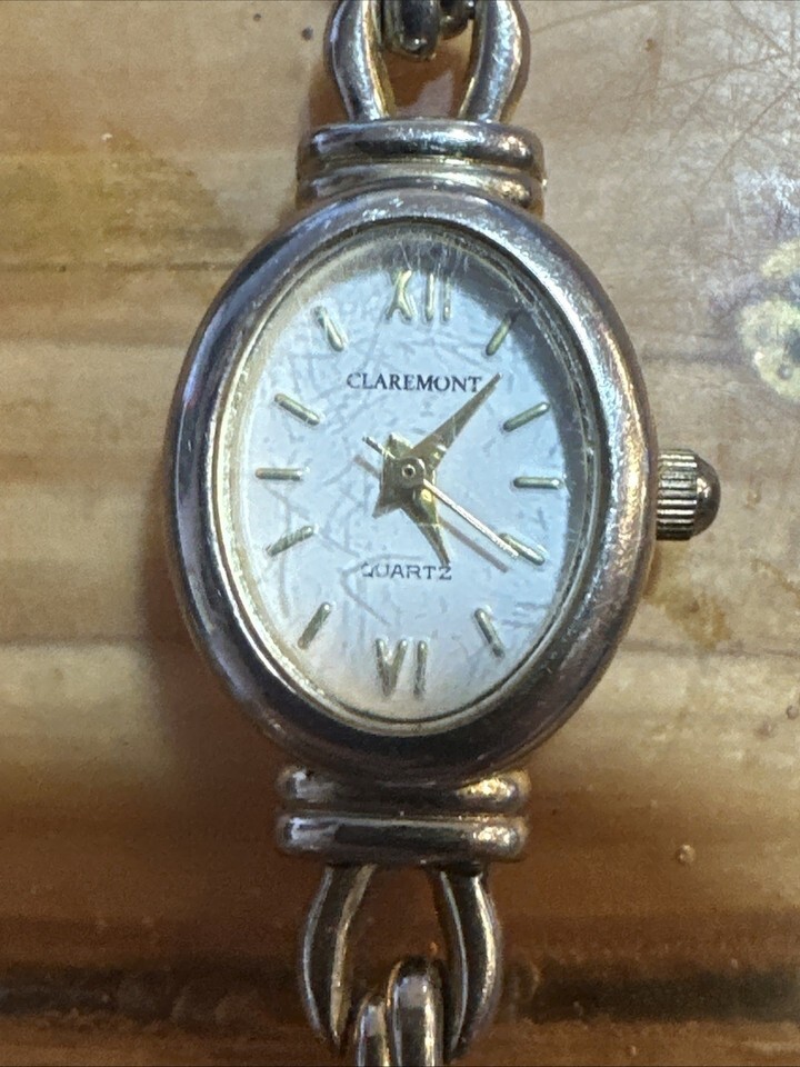 Works great new battery. Face is scratched. The Clarmont Watch for women features a luxurious design with a gold and silver tone stainless steel bracelet and case. The mother of pearl dial with Arabic and stick indexes adds a touch of elegance. This vintage timepiece has a quartz movement and is water-resistant with a 12-hour dial and seconds hand. Perfect for formal occasions, this classic watch from Timex is sure to make a statement.