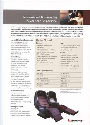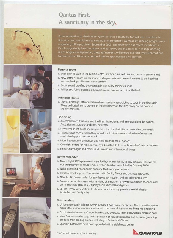 There are 3 different 2 sided single pages in this lot. Page one has a Boeing 747-438 Seat Configuration and photos of each class of service on one side and an Australia and New Zealand to North America Route Map and Fare Information on the other side. This page has a 3 1/2" edge tear. Page 2 on very heavy stock has a photos of the First Class Sleeper Bed on one side and pictures and information on First Class Amenities on the other side. Page 3 on very heavy stock has a photos of the New International Business Class Skybed Bed on one side and pictures and information on Business Class Amenities on the other side.