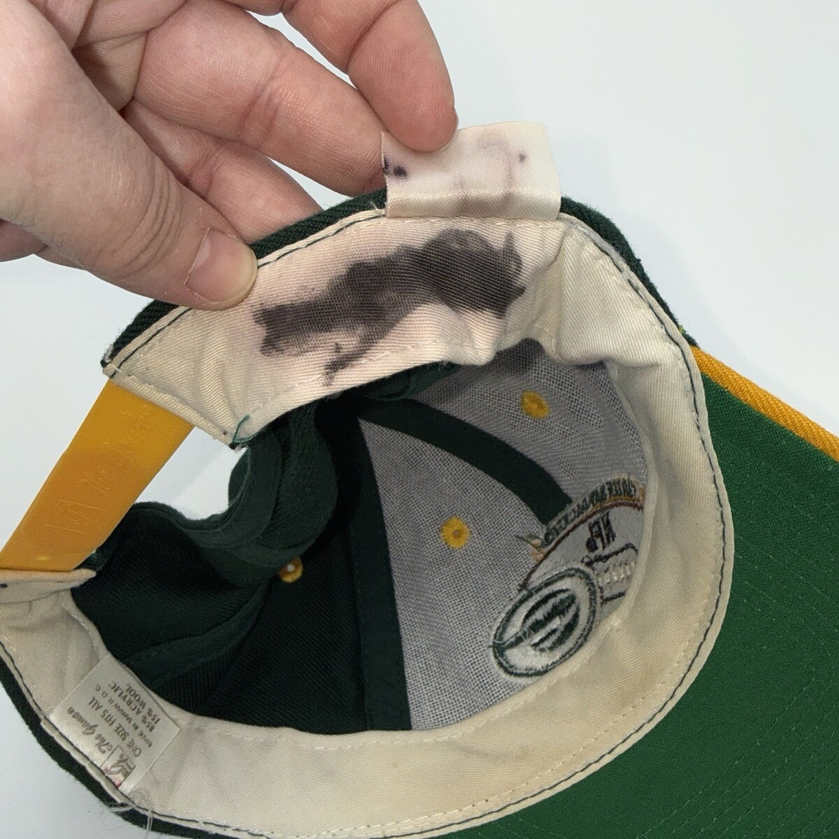 Good vintage condition. Minor discoloration on interior sweatband consistent with age, and some sharpie marks. No major stains, holes, or structural issues.