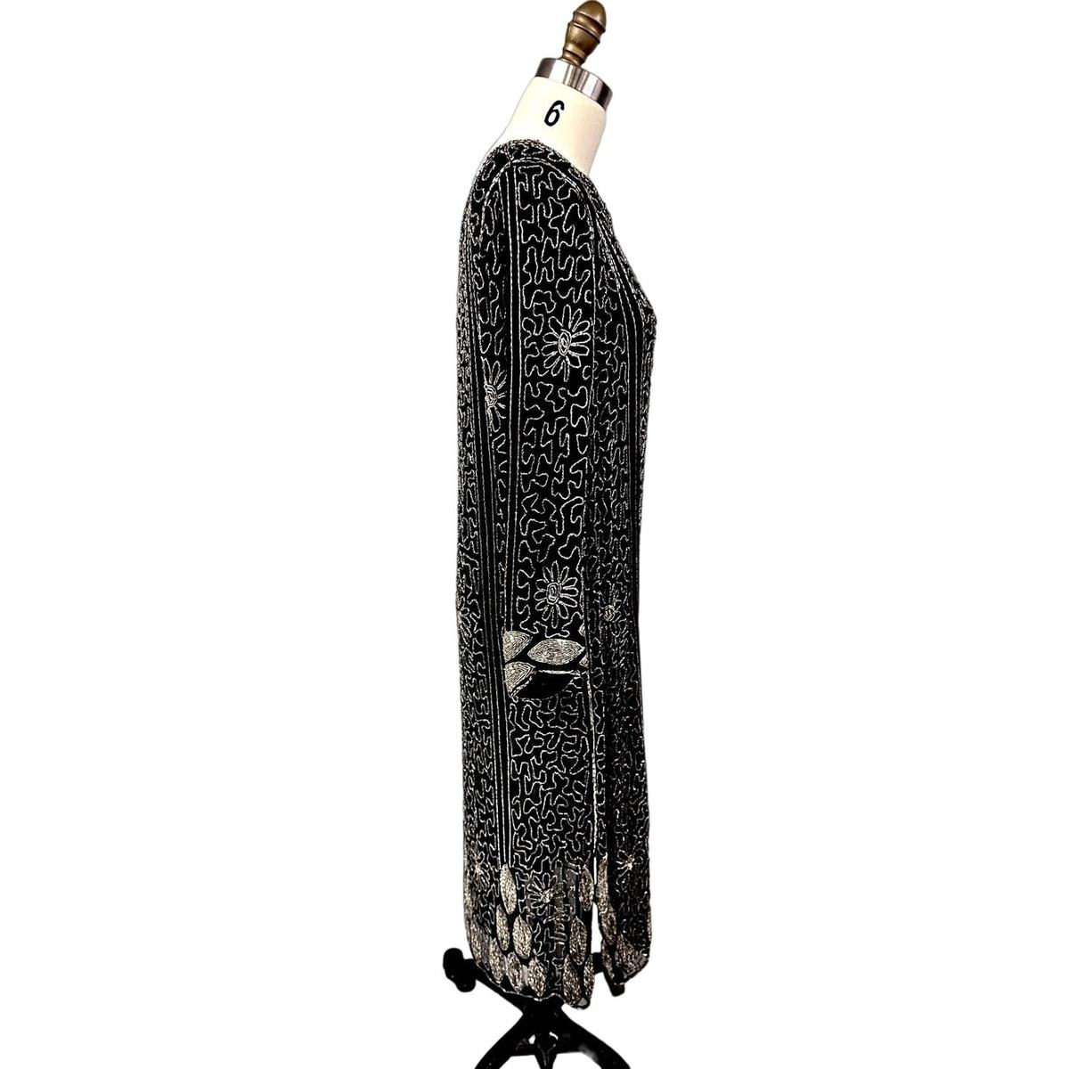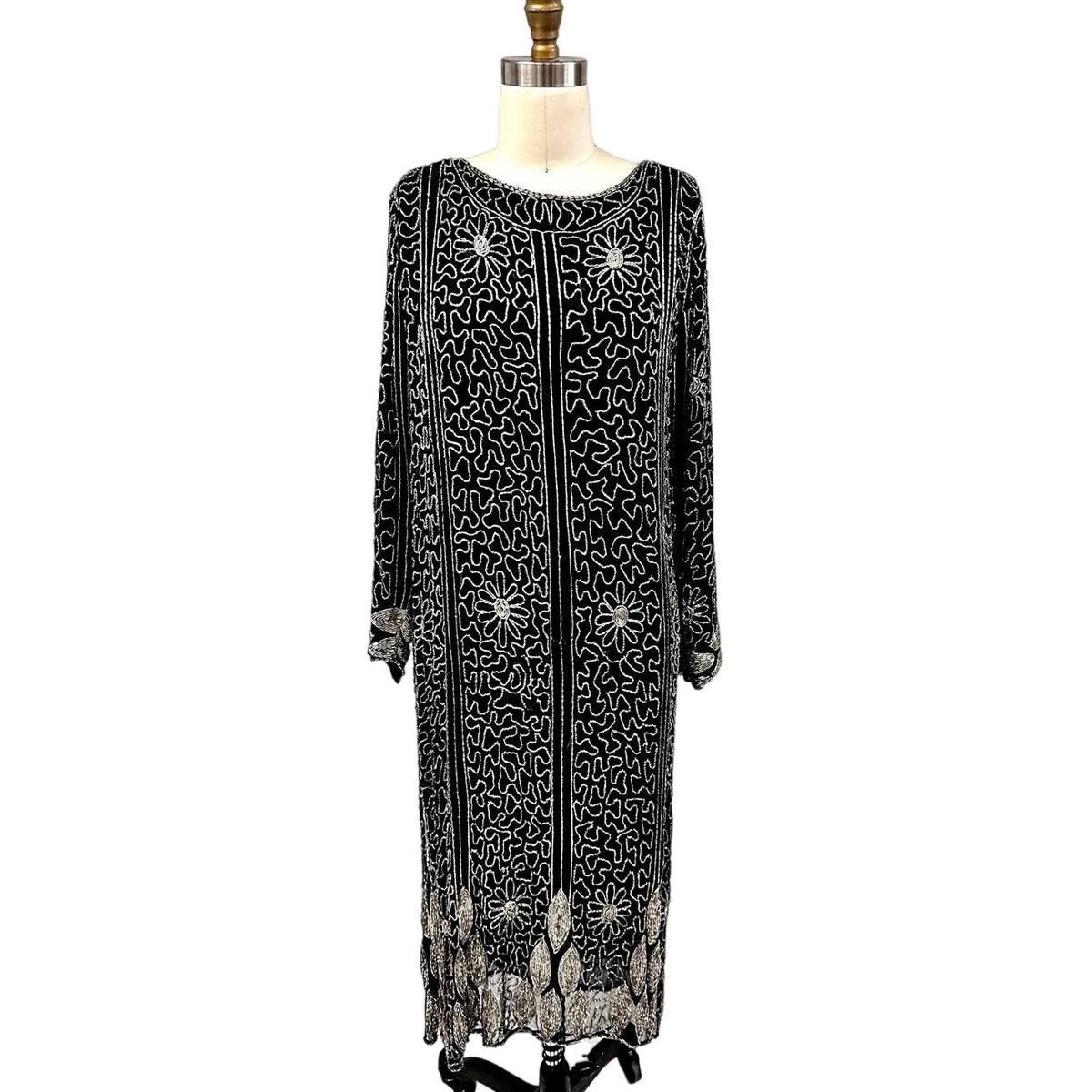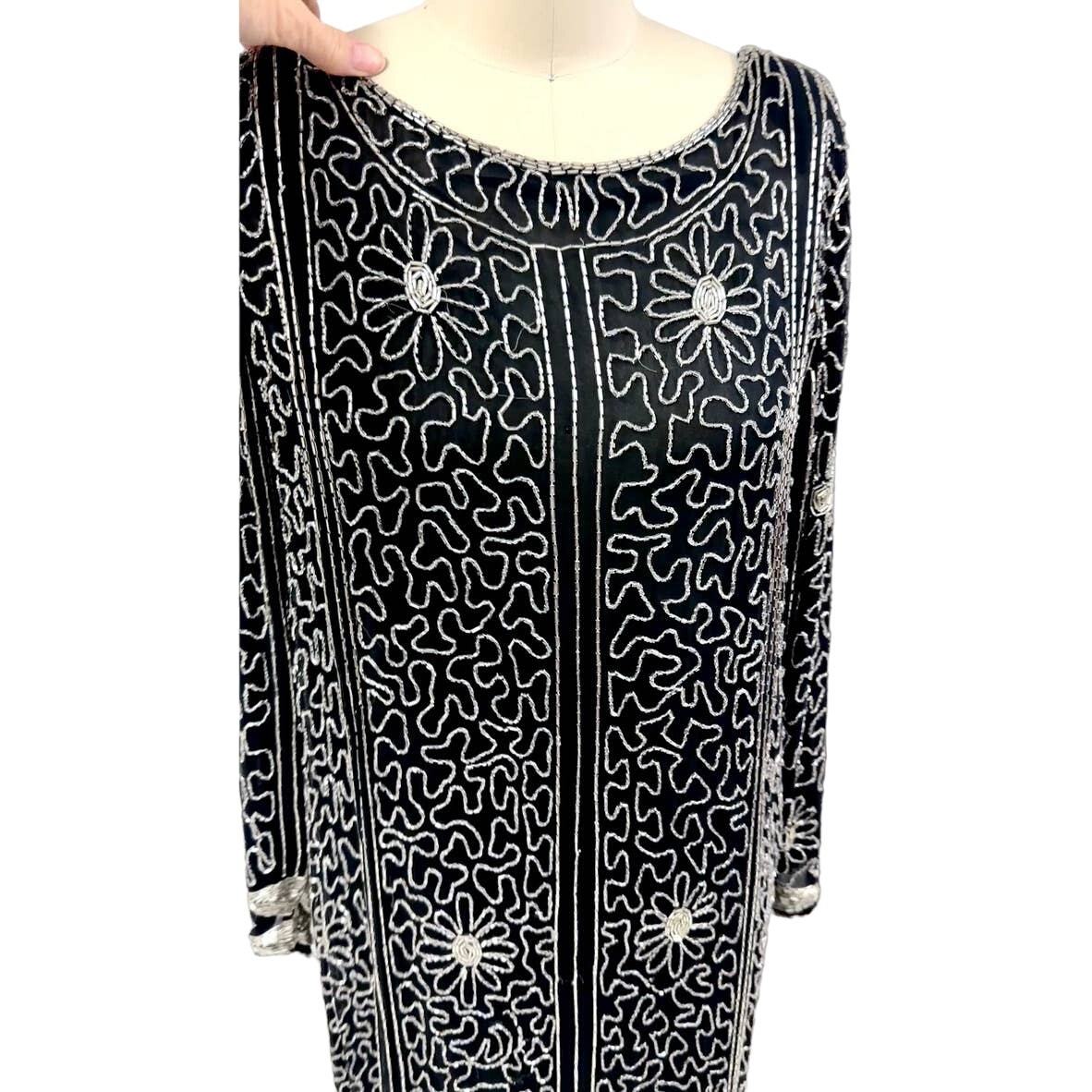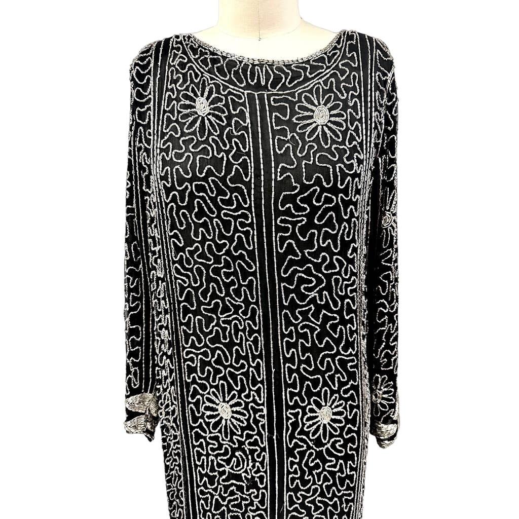VTG 1980s Saks Fifth Avenue Silver Beaded Black Silk Deco Dress M Flapper