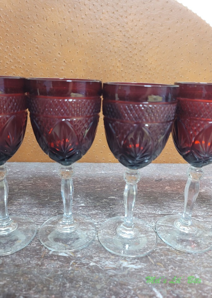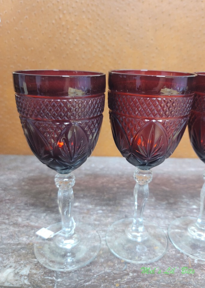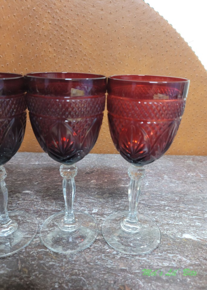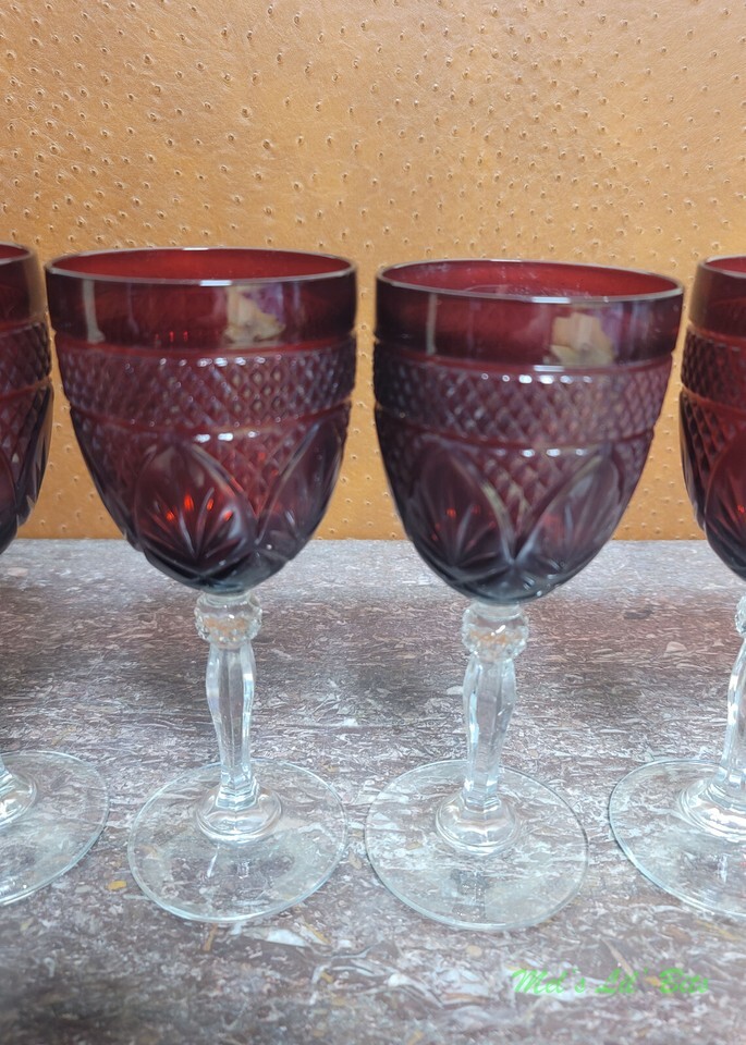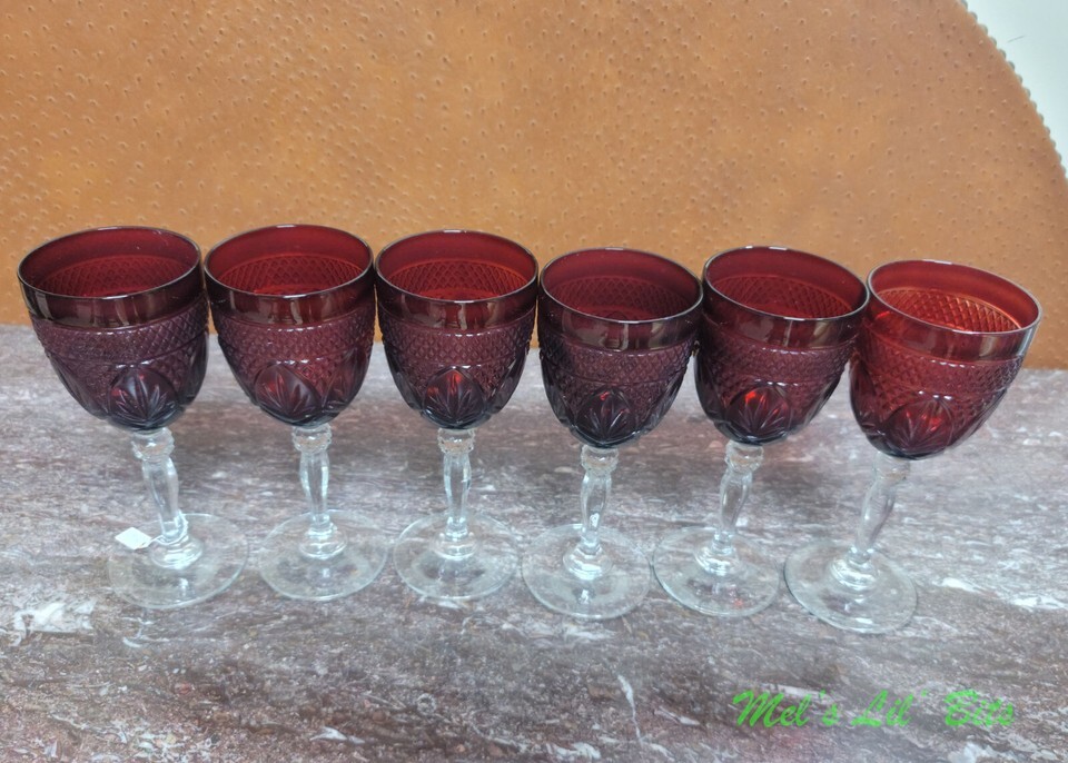 This is a set of six (6) - 8" Cristal D'Arques, ruby red clear, Vintage pattern, footed wine glasses.