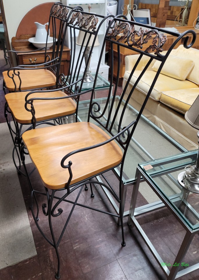 Wrought Iron Bar Stool Chairs with Wood Seats Set of 3