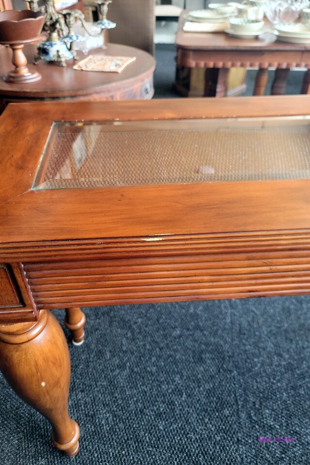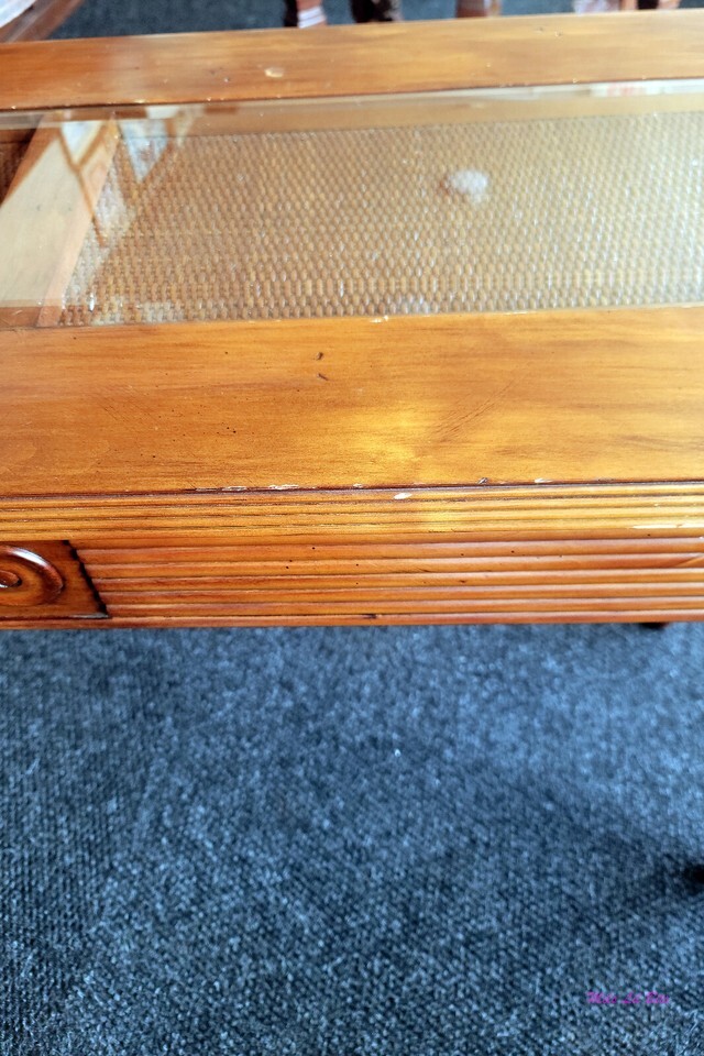 Rattan detail under the glass top. Legs are easily removed for shipping.