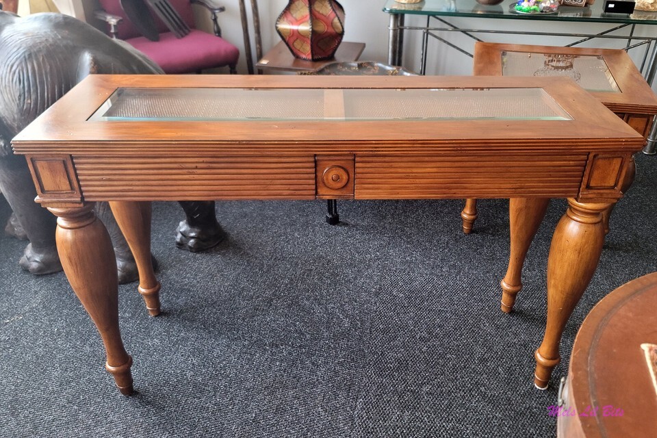 1980`s Klaussner Co. Wooden Console Sofa Table with Rattan Detail and Glass Top