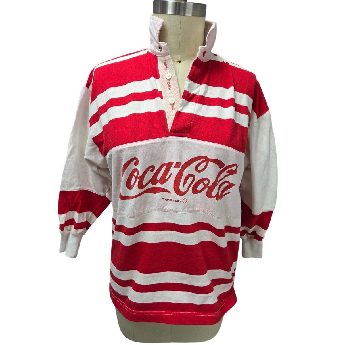 VTG 1986 Coca Cola Rugby Shirt Red White Logo Stripe Preppy M-L