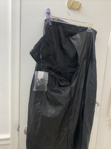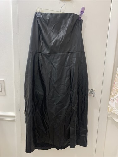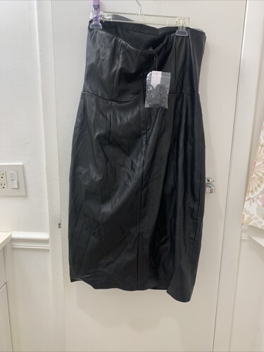 The White House Black Market dress in size 14 is a stylish and sophisticated choice for a variety of occasions. This knee-length dress features a classic black color with a sleek square neckline and strapless design, making it perfect for a wedding or party. The faux leather material and pencil dress style give it a sexy and edgy look, while the zip closure and side slit add a touch of allure. Whether you're looking for a dress for the winter, summer, fall, or spring, this dress is sure to make a statement. New with tag. Approx 18.5? armpit to armpit and 36 inch length. Front slit. Sheath dress.