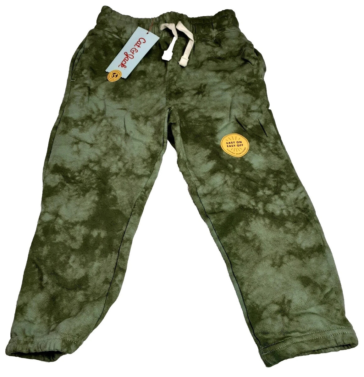 Get ready to make a fashion statement with these Cat Jack? army green toddler jogger pants, perfect for any occasion! Featuring a cool tie-dye pattern and drawstring closure for easy wear, these pants are made of 100% cotton fabric that is stretchy and comfortable. With an adjustable waist, footless design, and pockets for convenience, these pants are sure to be a hit with your little one.