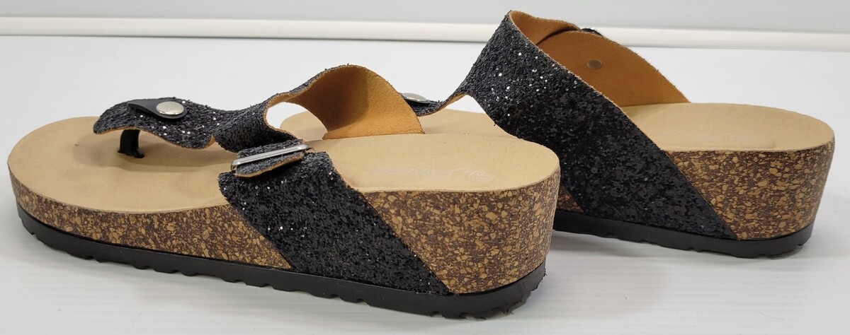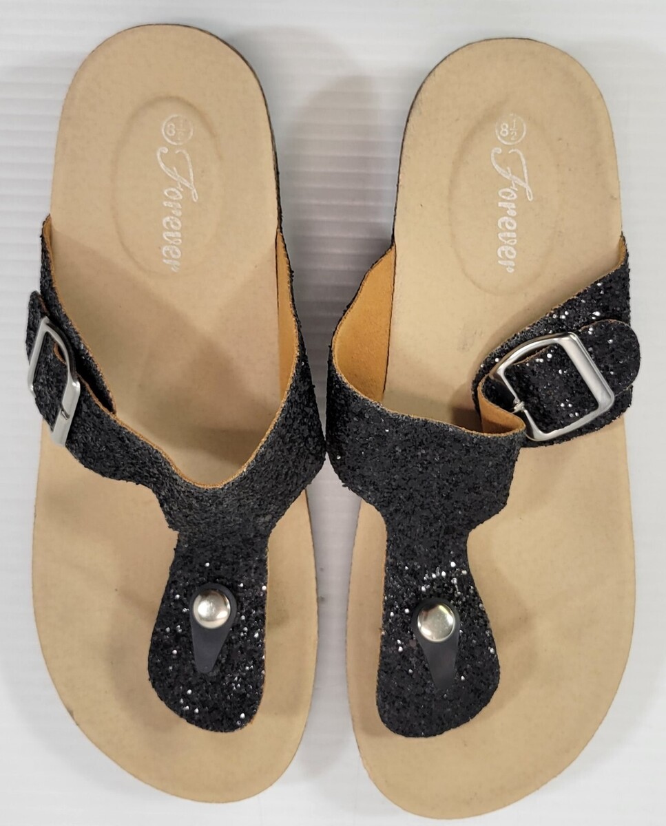 MT) Forever Women's Sparkle Glitter Black Slip-On Split Toe Wedge Sandals 8.5