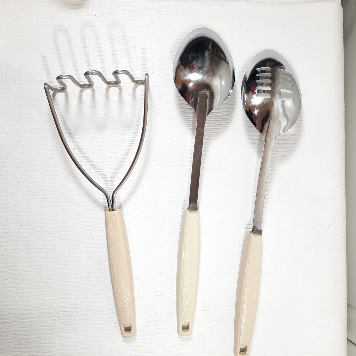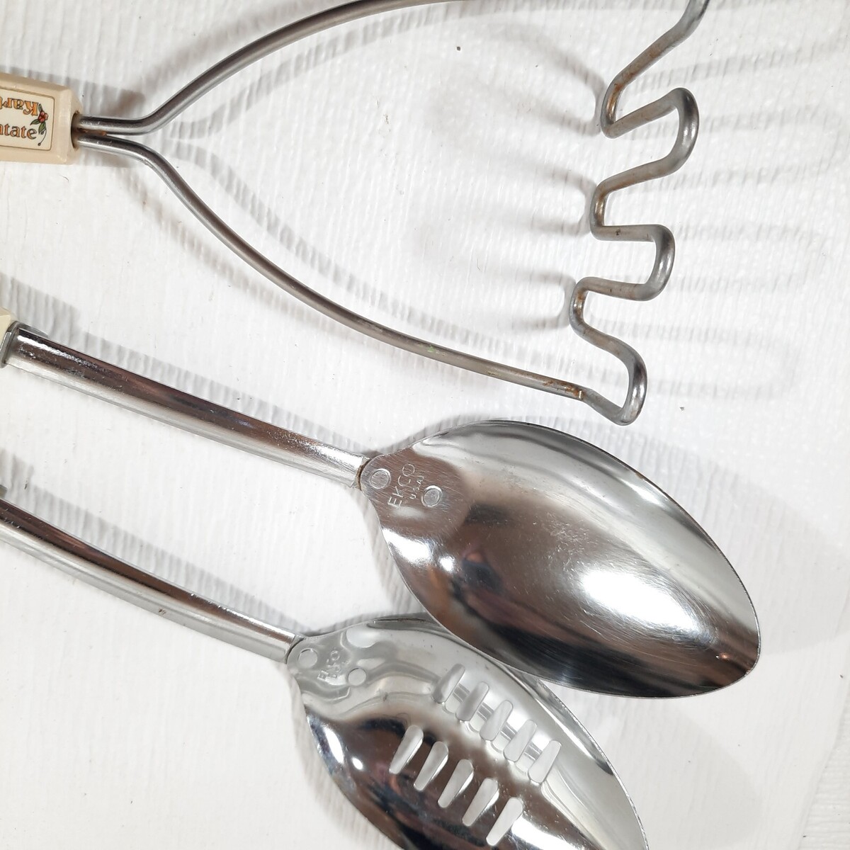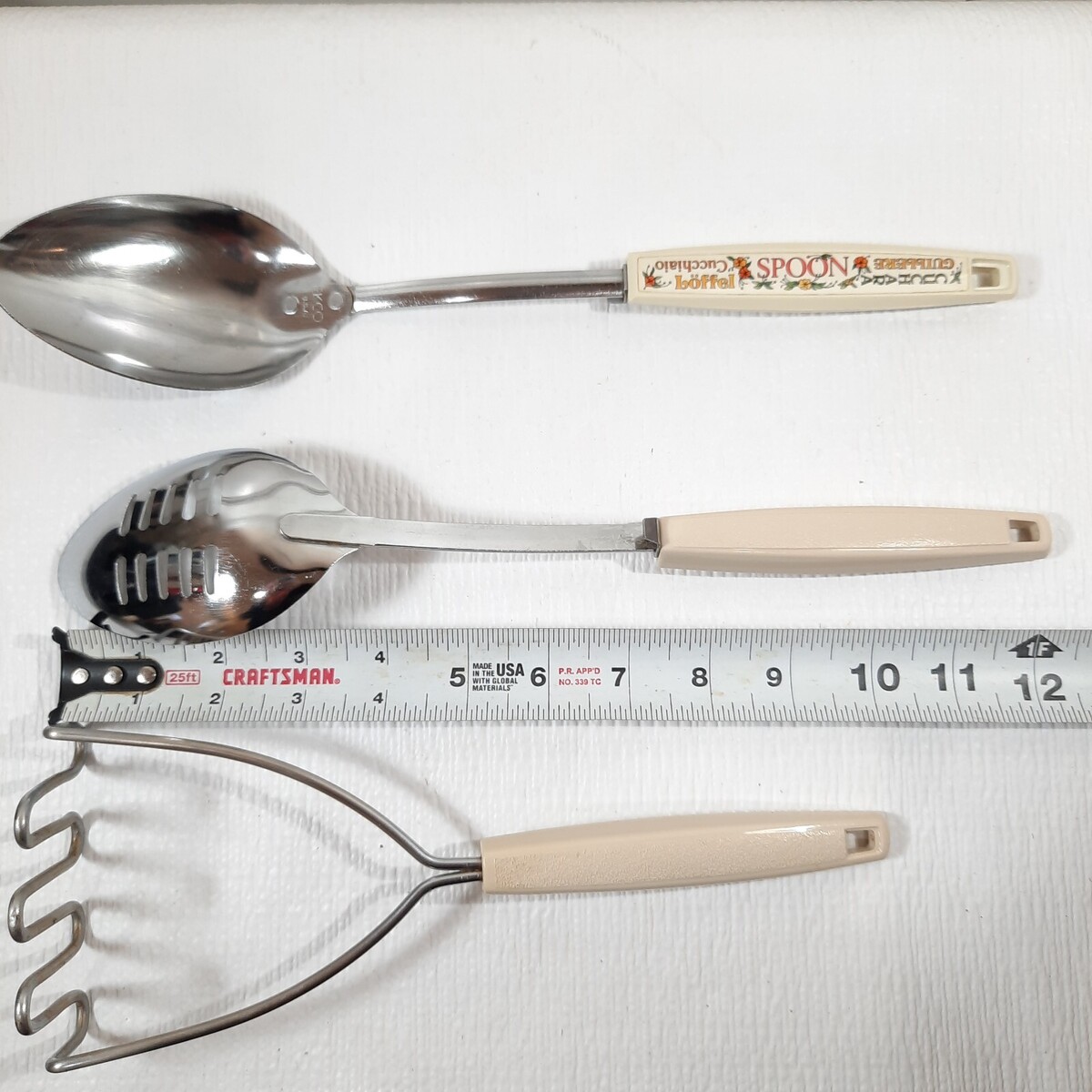 Includes slotted spoon, serving spoon, and potato masher. Discoloration, wear, marks, some rust/patina as shown. Vinyl handles with stainless steel.