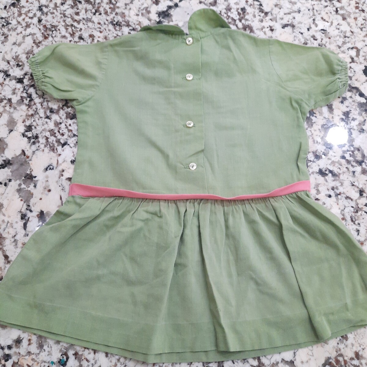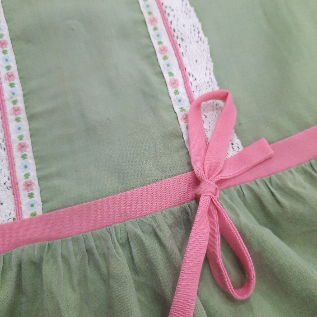 Some light colored stains/marks as shown. Lightweight cotton with peter pan collar, lace floral accents with pink belted waist. See pics for measurements as vintage sizing may vary.