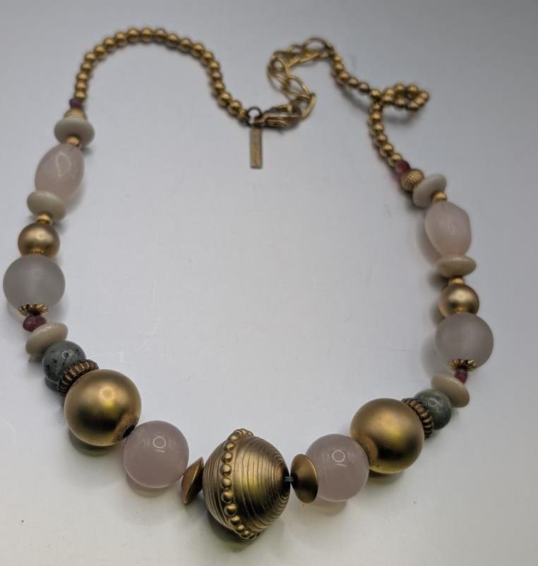 Costume Jewelry Casual Corner Pink Sage Green Gold Beaded Necklace 18" long - brushed gold tone statement beads. Signed on the original hangtag. No smoke or pet odor.