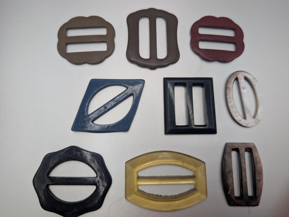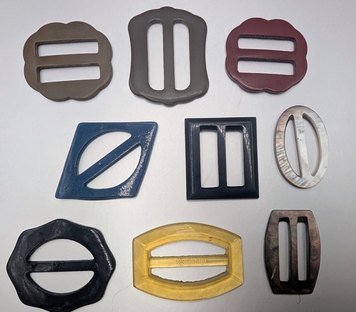 Vintage Costume Jewelry Clothing Lot Belt Buckles Scarf Slides Lucite Shell MOP - measures 1.5" to 2" long. variety of styles and colors. Direct from a local estate. No smoke or pet odor.