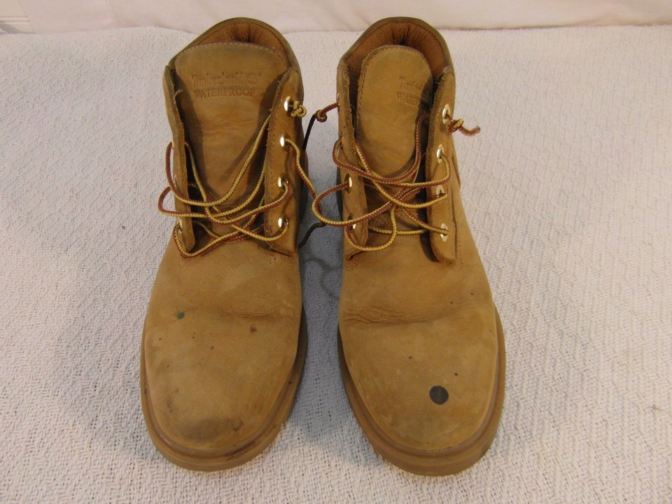 Men's Timberland Premium TAN Leather 9 Lace Up Work Ankle Boots Staining 33129