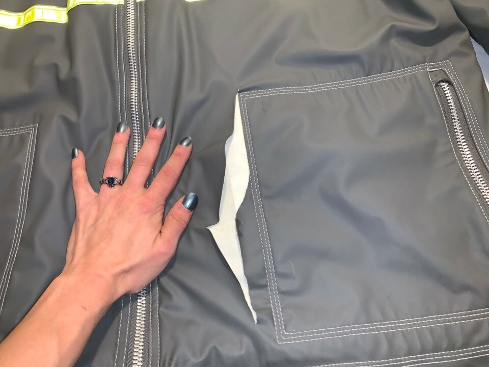 DEFECTS: MULTIPLE TEARS OF OUT MATERIAL LAYER DOES NOT GO ALL THE WAY THROUGH JACKET.