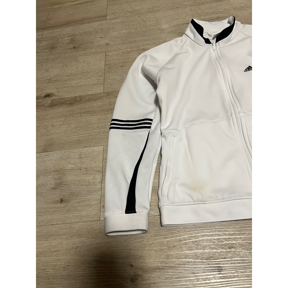 Elevate your active style with this Adidas ClimaLite track jacket. The crisp white fabric, accented by iconic black stripes on the sleeves, creates a timeless athletic aesthetic that moves with you. Designed for comfort and performance, this jacket features a full zip front and a stand-up collar for a sleek silhouette. Two convenient side pockets offer a place to stash essentials. Noticeable light discoloration on the front left hip area, as indicated in the photos, adds a touch of lived-in character. Perfect for a morning jog, a casual day out, or layering for a sporty vibe.