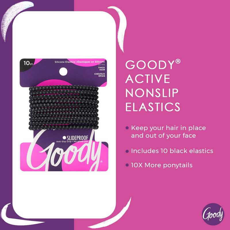 Goody Elastics: Keep your hair in place and out of your face with the Goody Active Nonslip Elastics. These elastics feature an anti-slip grip so whether you?re playing sports or running errands, your hair is sure to stay in place. Includes 10 black elastics
