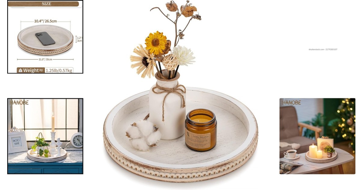 Chic 11.8" Round Wooden Tray - Elegant Farmhouse Centerpiece for Any Occasion