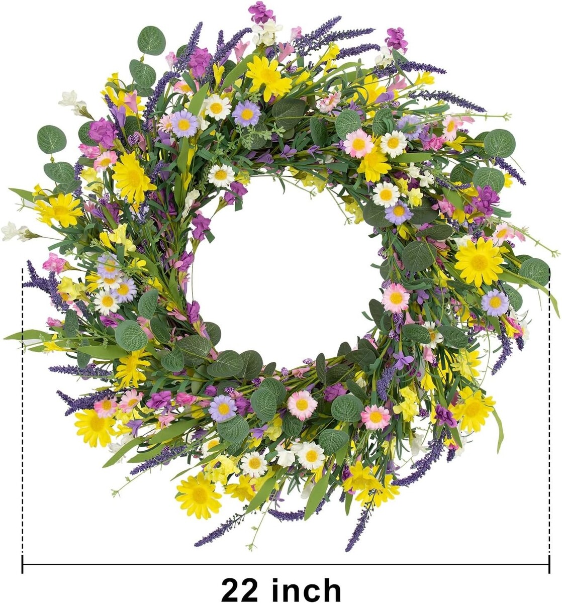 22-Inch Handmade Spring Wreath with Lavender & Daisy - Colorful Front Door Decor