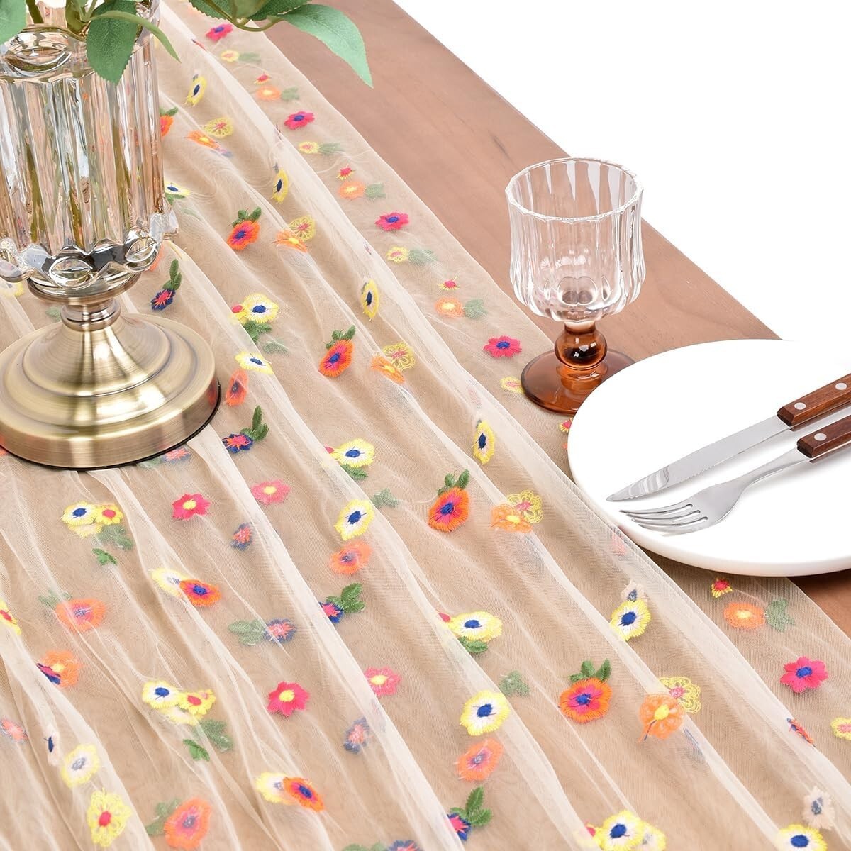 Versatile 10ft Champagne Floral Tulle Table Runner for Indoor and Outdoor Events