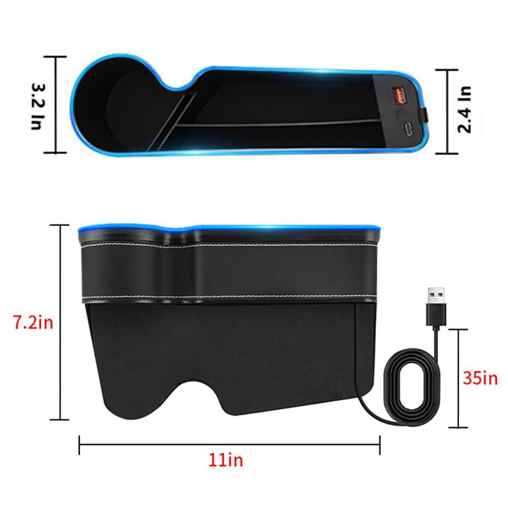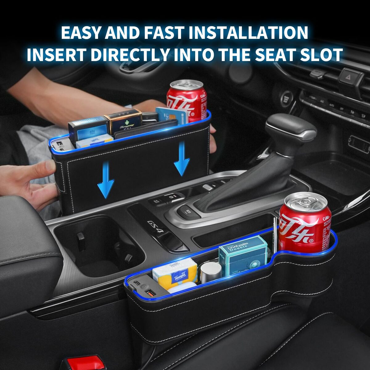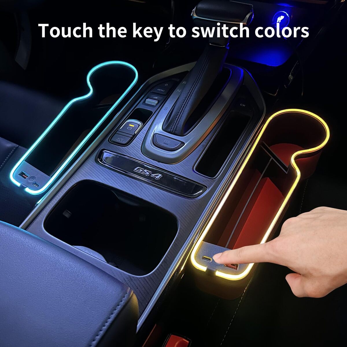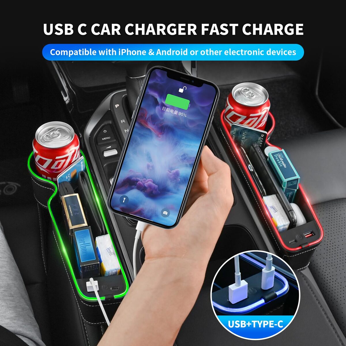 1[USB + C charging port,fast car charger]This 2026 the latest 7 color LED car seat gap filler which comes with 2 USB+C charging ports.Specially design support fast charging up to 56W,perfect compatible with USB type C device,this fast charger widely compatible with Android, iPhone 17/Pro/ Pro max,iPad/Samsung Galaxy,Multiple charging options designed to allow you to charge freely in car, no need to worry about electronic devices running out of power during long-distance driving.,2[7 color changing LED with memory function]Car seat organizer front seat gap comes with 7 color changing led 9 changing modes,include 7-color flash/7-color gradient cycle/7-color constant brightness(red,blue,green,purple,ice blue,yellow,white).It take easily to switch,seat gap filler have memory function,which automatic returns to the previous mode when starting the car without having to re-select it.The 7-color ambient lights are very cool, it feels like driving a party in a car.,3[Free 1 dual USB fast charge cigarette lighter adapter]This 7-color keketuohai seat gap filler organizer 2 pack is equipped with 1 dual USB cigarette lighter adapter,this car's fast charger is an unexpected gift.It can output a maximum charging power of 56W and fit for any car with a cigarette lighter socket, including cars,SUV Pickup and off-road vehicles.In case this cigarette lighter breaks down, any dual-USB cigarette lighter adapter can be replaced.,4[7-color ambient light with hidden touch switch]The hidden touch switch of the car gap pocket front seat is the latest technological design,compared with the old style it looks so beautiful and textured,gently touch the switch to freely switch the switching mode of the ambient light(popping flash, cycle change, monochromatic constant light), long term use without damaging, so that you can easily choose your favorite ambient lighting modes or colors, it's a delightful new experience!,5[Streaming lights are brighter and more vivid]The latest 7-color auto console side storage box optimizes the ambient light. The streamer light bar is brighter and cooler without dazzling, the atmosphere is fuller, and the light tone is vivid and soft. As night falls, turn on the cycle gradient mode and match the rhythm of the music, making people feel like they are on a disco stage, like having a party in a club.