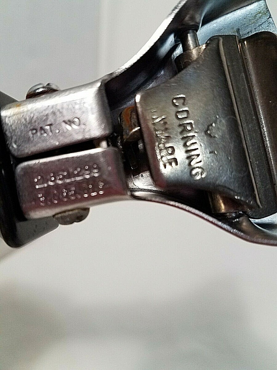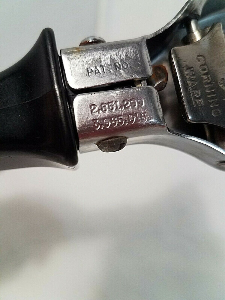 This is vintage, original Corning Ware detachable twist, lock-on black handle for pots, casseroles, skillets and sauce pans. Marked Corning Ware on the underside with the patent information. The black portion of the handle measures 4-1/2" with the entire length from metal stainless pointed ends to the loop measuring 7-1/2". Hooks on the side of casserole or pot and locks in place with a twist of the end of the handle