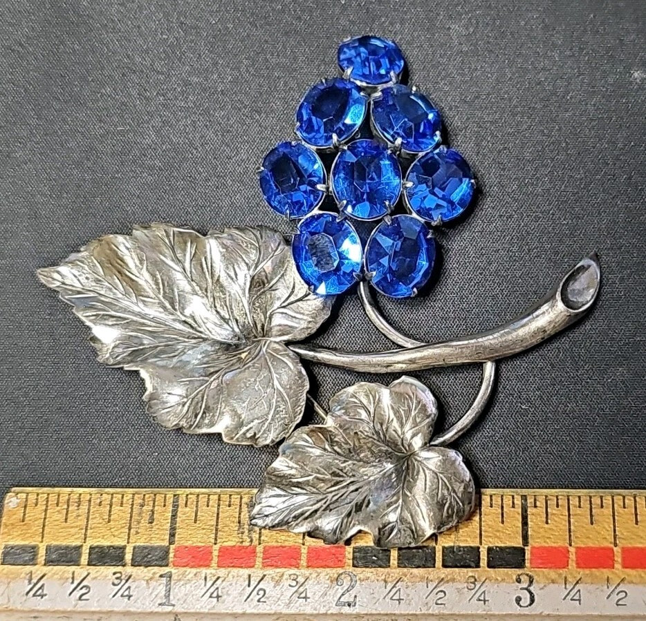 UP FOR SALE: This stunning vintage silver-tone brooch features a beautifully detailed grape cluster design, set with vibrant blue rhinestones in marquise and round cuts. Likely from the mid-century era (1950s-1960s), this brooch has high-quality craftsmanship reminiscent of Trifari, Coro, or Lisner, though it is unmarked.