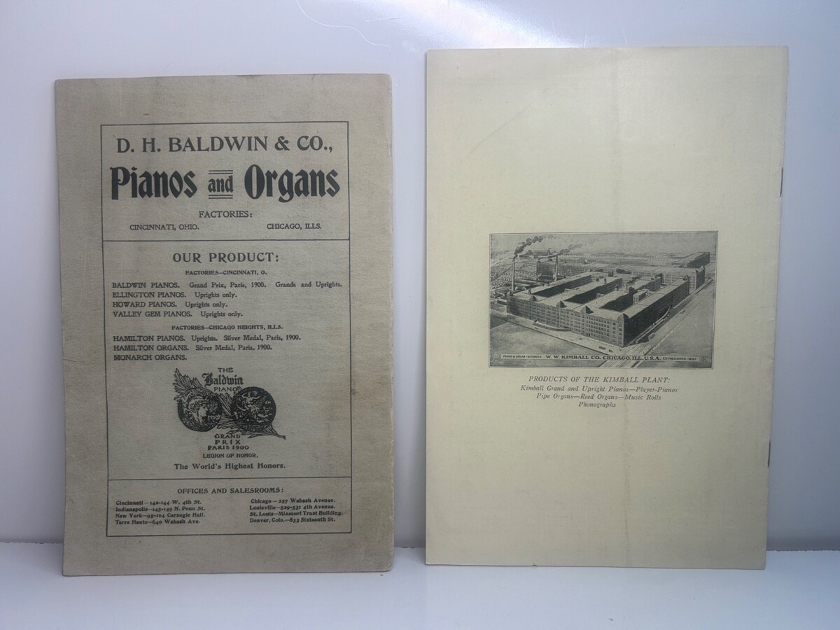 Up for sale is a premium pair of original antique music booklets from two of the most iconic names in American piano manufacturing: Baldwin and W.W. Kimball. These are not modern reproductions, but original promotional "premiums" from the early 20th century.
