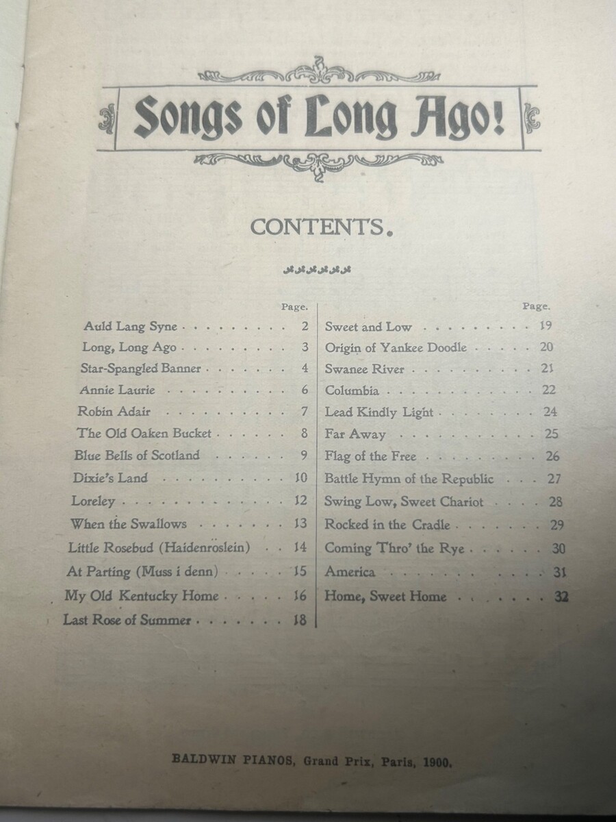 Item 1: "Songs of Long Ago" ? Published by D.H. Baldwin Co. (c. 1900)