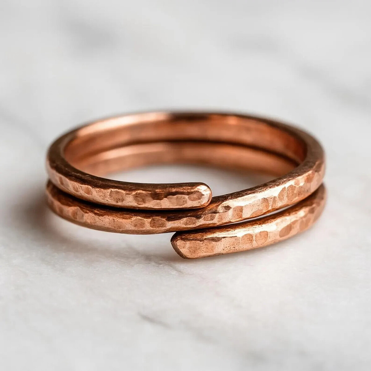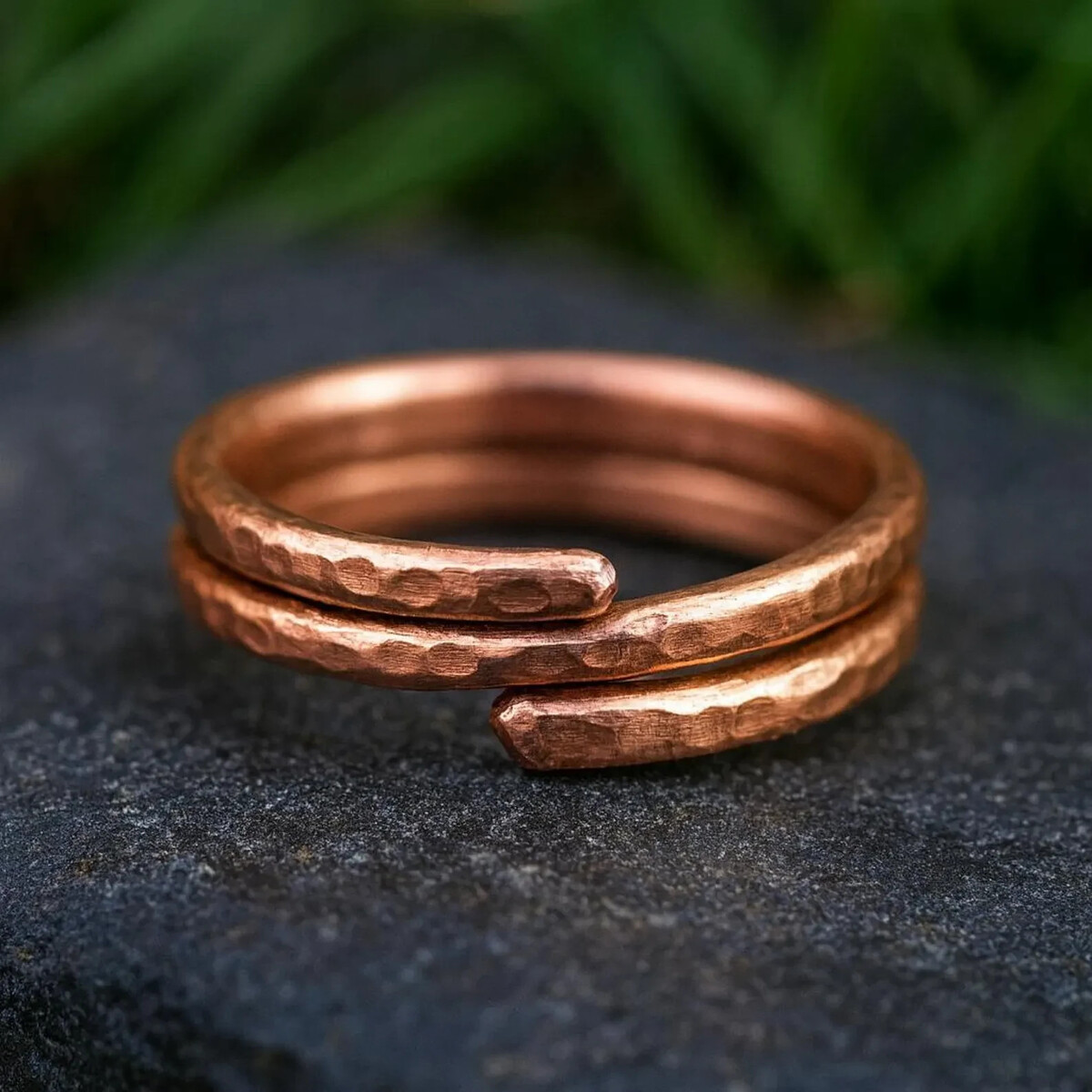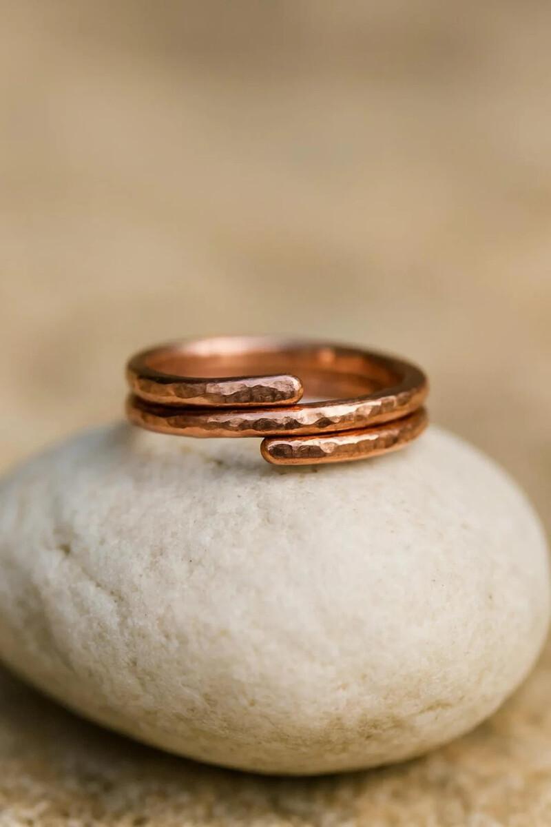 This solid pure copper ring is a minimalist and unisex piece designed for healing purposes. Handmade in India, the ring features a spiral design that symbolizes beauty, nature, art, luck, love, bohemian style, and healing properties. The band is crafted with 999 metal purity and showcases excellent cut grade, making it a unique and meaningful accessory for various occasions like engagement, Mother's Day, Christmas, graduation, anniversary, Father's Day, or birthdays. With a stackable style and bezel setting, this copper ring is a symbol of artistry and craftsmanship.