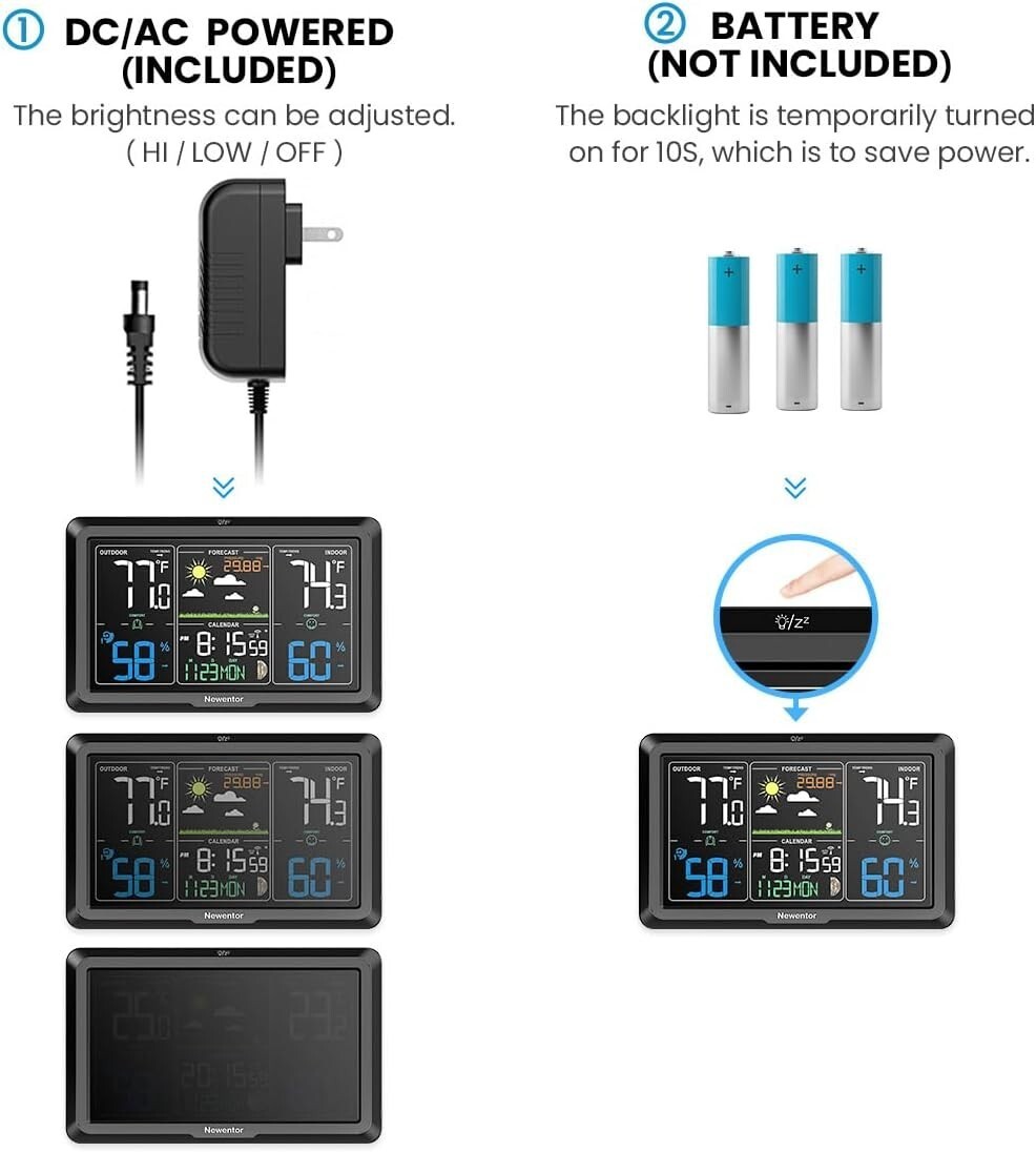 Adjustable Backlight: Powered by batteries (not included), the backlight turns on for 10 seconds to save energy. When plugged in, enjoy a continuously illuminated display with adjustable brightness settings (High-Low-Off).