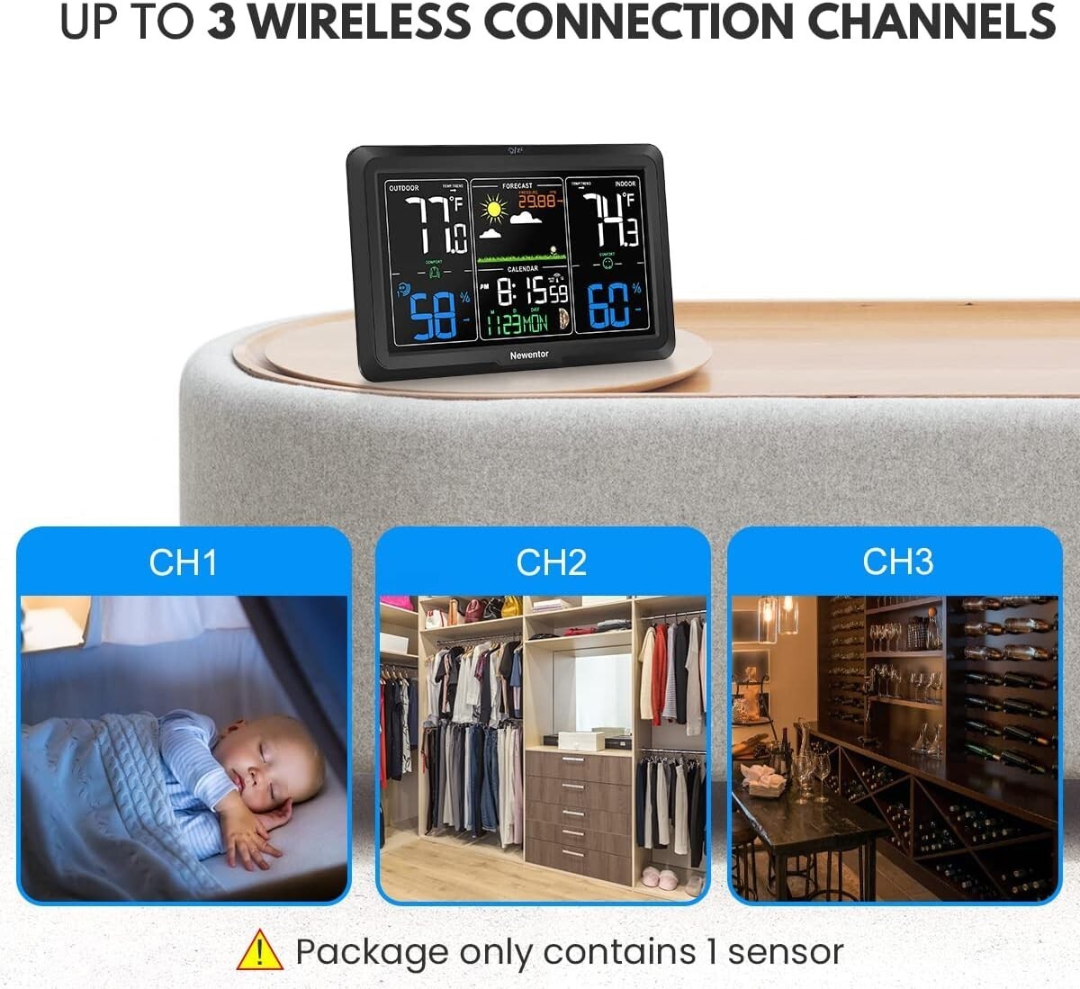 Multiple Sensors: Equipped with 3 remote channels to monitor various locations - baby room, storage area, wine cellar, vegetable shed, etc. (Note: package includes 1 sensor).